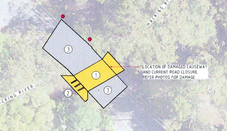The latest Neighbourhood Forum 1 report, provided by convenor Warwick Erwin, states: "Council’s response to NF1’s and residents requests for the design details of the replacement causeway was a 'sketch' superimposed on an aerial photo, as below, but no design details. Note the three debris deflector walls on the upstream side of the causeway."