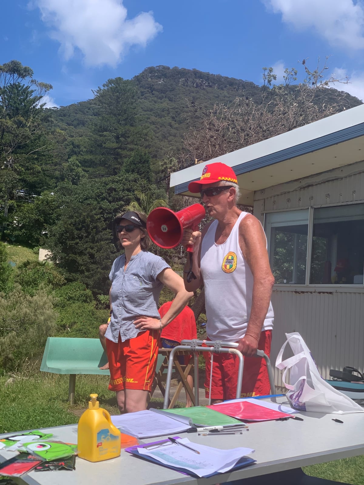 Coalcliff Surf Life Saving Club's David Winner and Brigid Collaery were there to give the club members a safety briefing before heading down to the water.