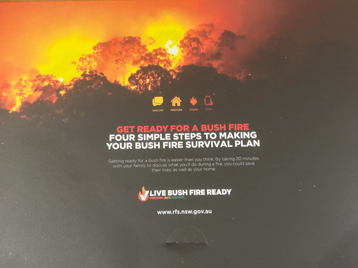 Outside of house maintenance, this means get your emergency plan ready, tell your household and do a safety drill. Go buy a fire-proof safe or case to hold important documents and find out where your local emergency safety refuge is – mine is Pinecourt Park, Austinmer.