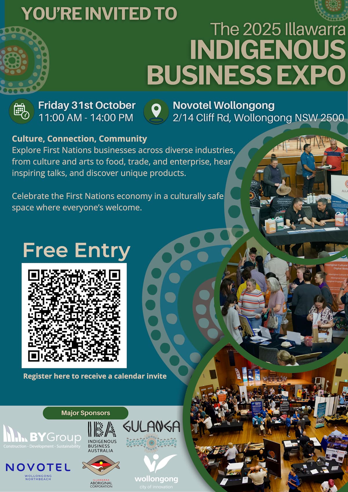 The 2025 Illawarra Aboriginal Business Expo will be held at the Novotel on Friday, 31 October and is proudly sponsored by Wollongong City Council, Gulanga (Rick Higgins Aboriginal business), BY Group (Aboriginal business), Illawarra Aboriginal Corporation (Aboriginal business), Indigenous Business Australia (Aboriginal business) and Novotel Wollongong North Beach.