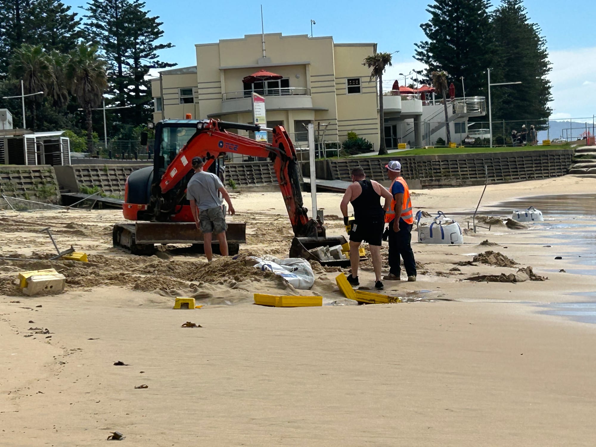 In late March, during the huge seas created by the East Coast Low, a large section of the safety fence protecting the sea wall construction zone was washed away.
