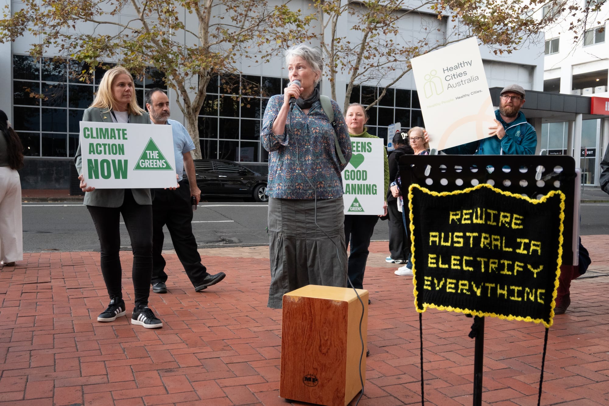 Cr Jess Whittaker holds a Climate Action Now sign as fellow Greens Cr Deidre Stuart addresses an electrification rally outside council in 2025. Photo: Illawarra Flame