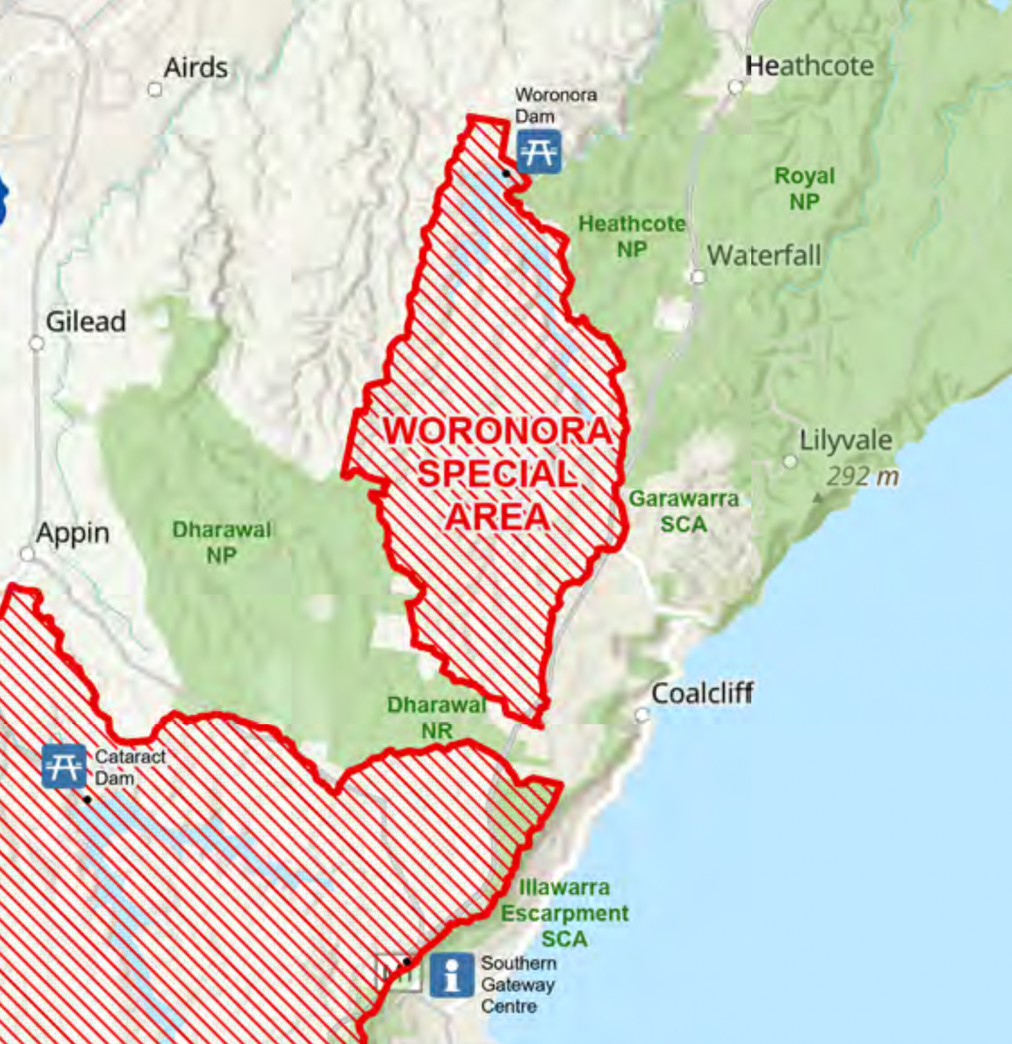 The development application area in Peabody's documents. At right: The Woronora Special Area on a WaterNSW map.
