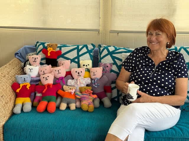 Each one is knitted or crocheted with varying colours, sewn together and stuffed at our teddy days and a unique face sewn on. Our wonderful communities often donate eight-ply yarn that helps with making our bears.