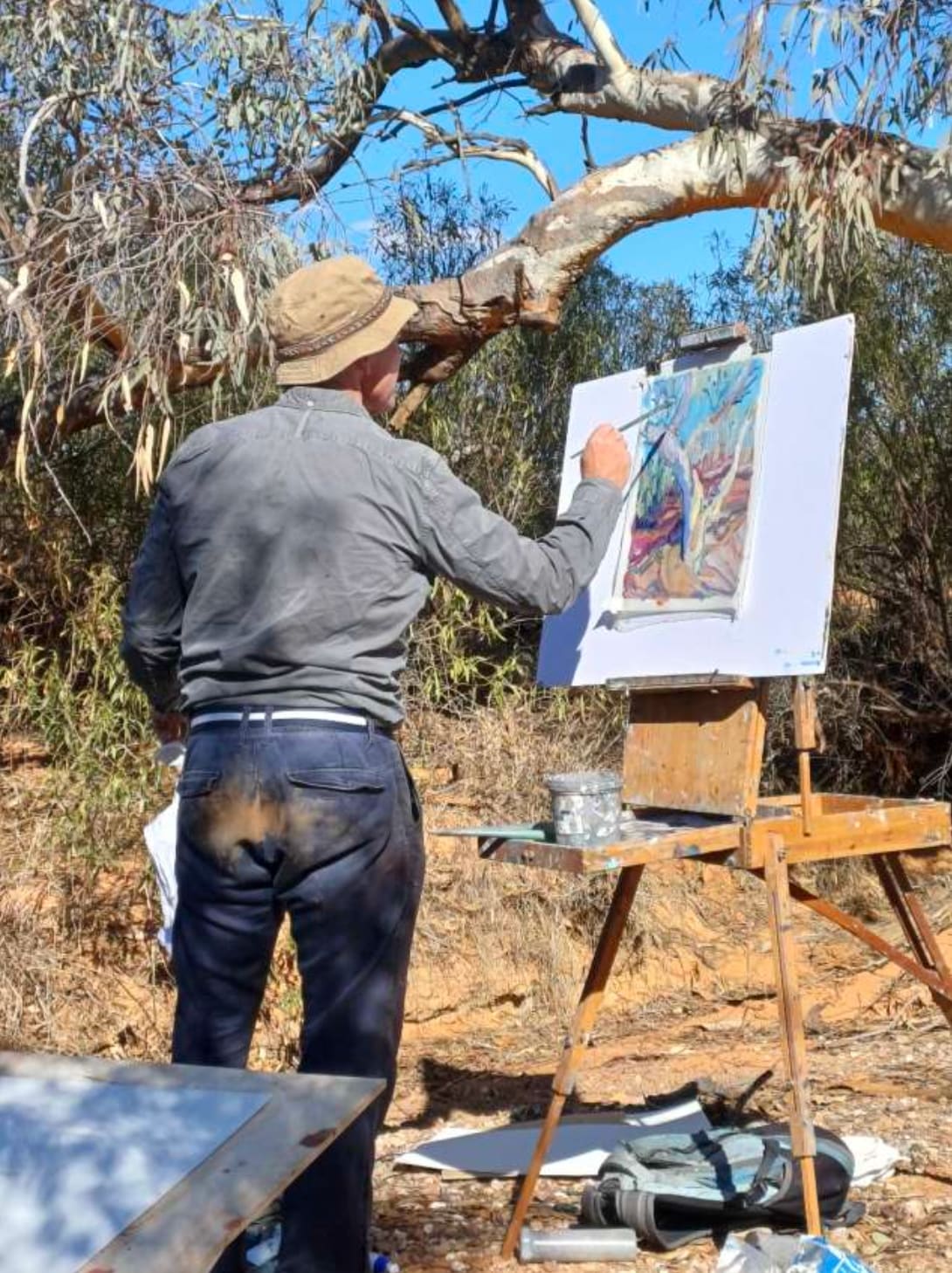 The Fowlers Gap Tour 2025 exhibition features the work of 15 artists from around Australia who were a part of an art expedition in July to Fowlers Gap in Western NSW. Of the 15 participants, 11 were students and four were staff: myself; my son Matt Frost, who helped with the food and is a tattoo artist at Solid Forge in Minto; Tanya Stubbles, the well-known artist from Coledale; and Etienne Deleflie from Corrimal, a media and design artist and former lecturer at UOW.