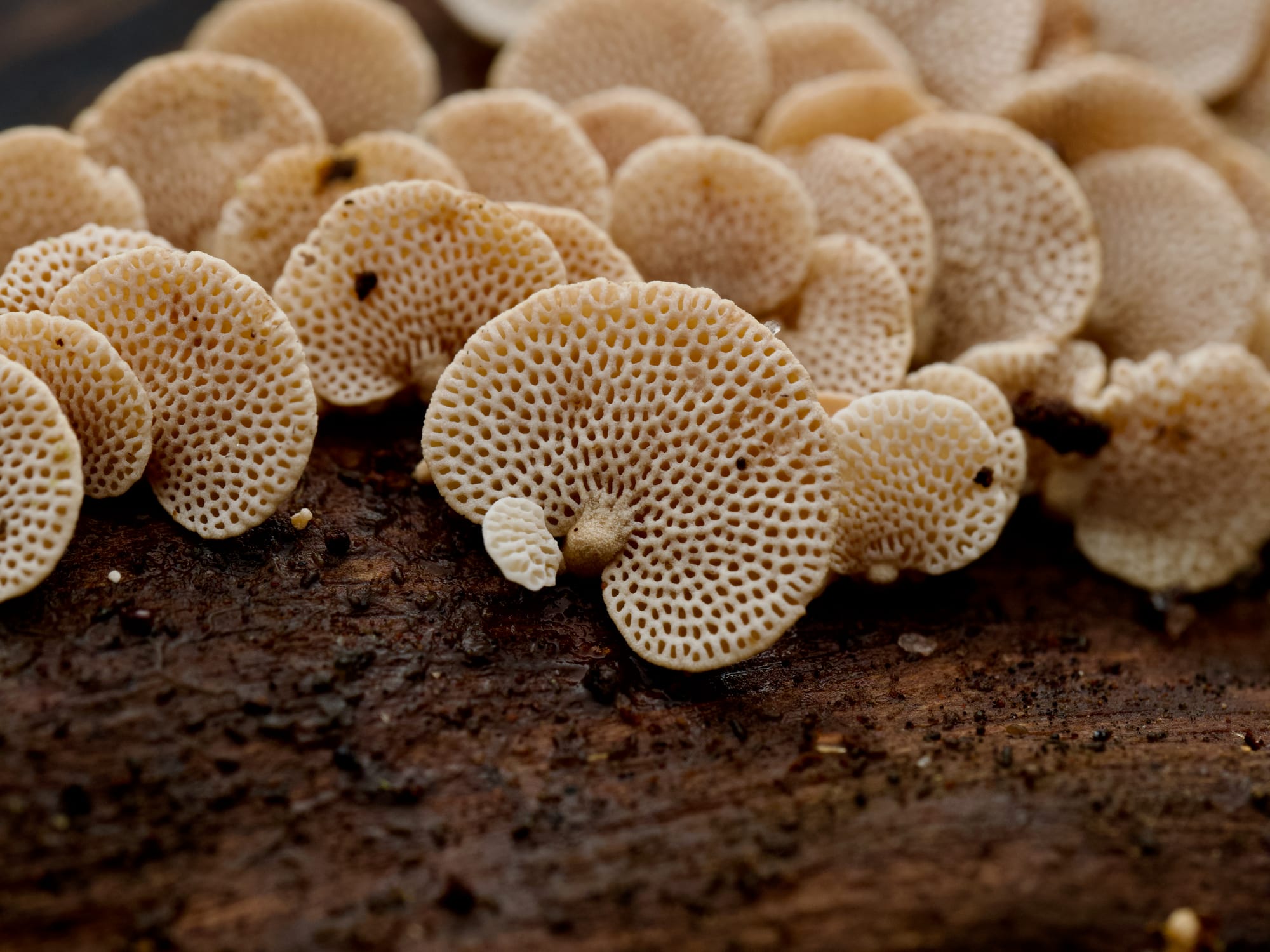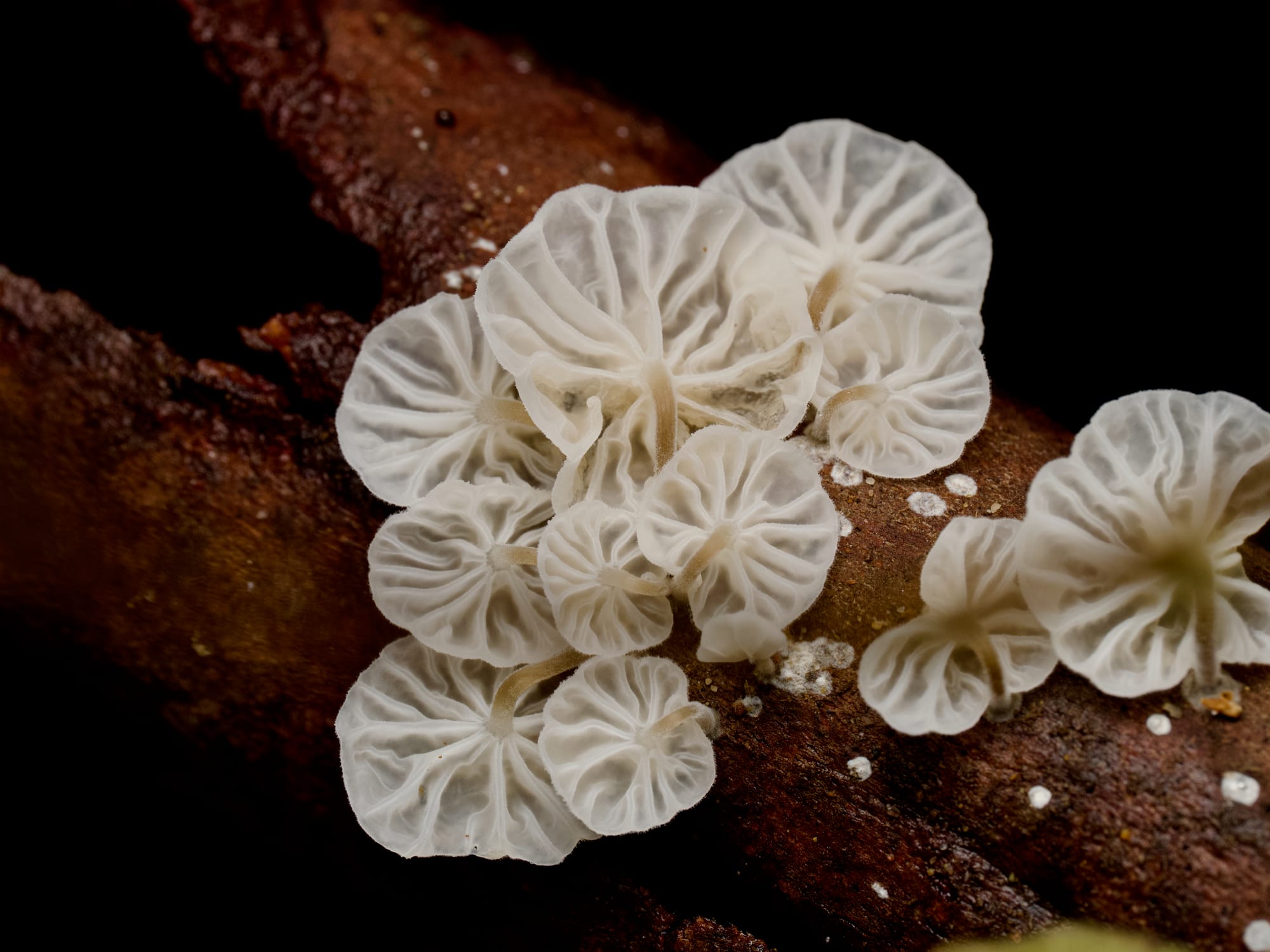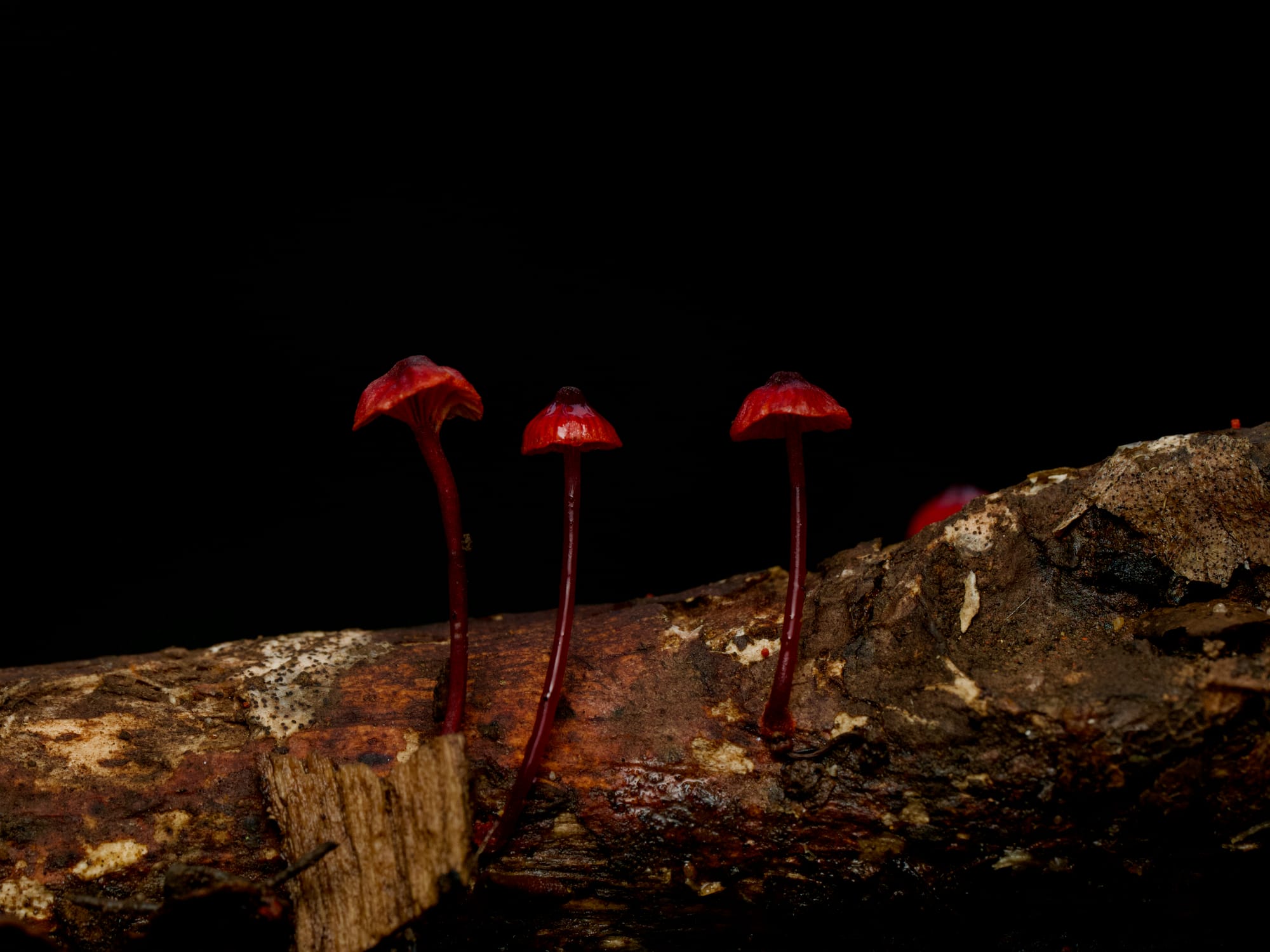 At eye level, look for dinner plate-sized bracket fungi. These are often leathery or woody and come in a beautiful array of colours. Among the leaf litter, you can expect several species of super-tiny but very lovely specimens. I especially love the teeny red bonnets.