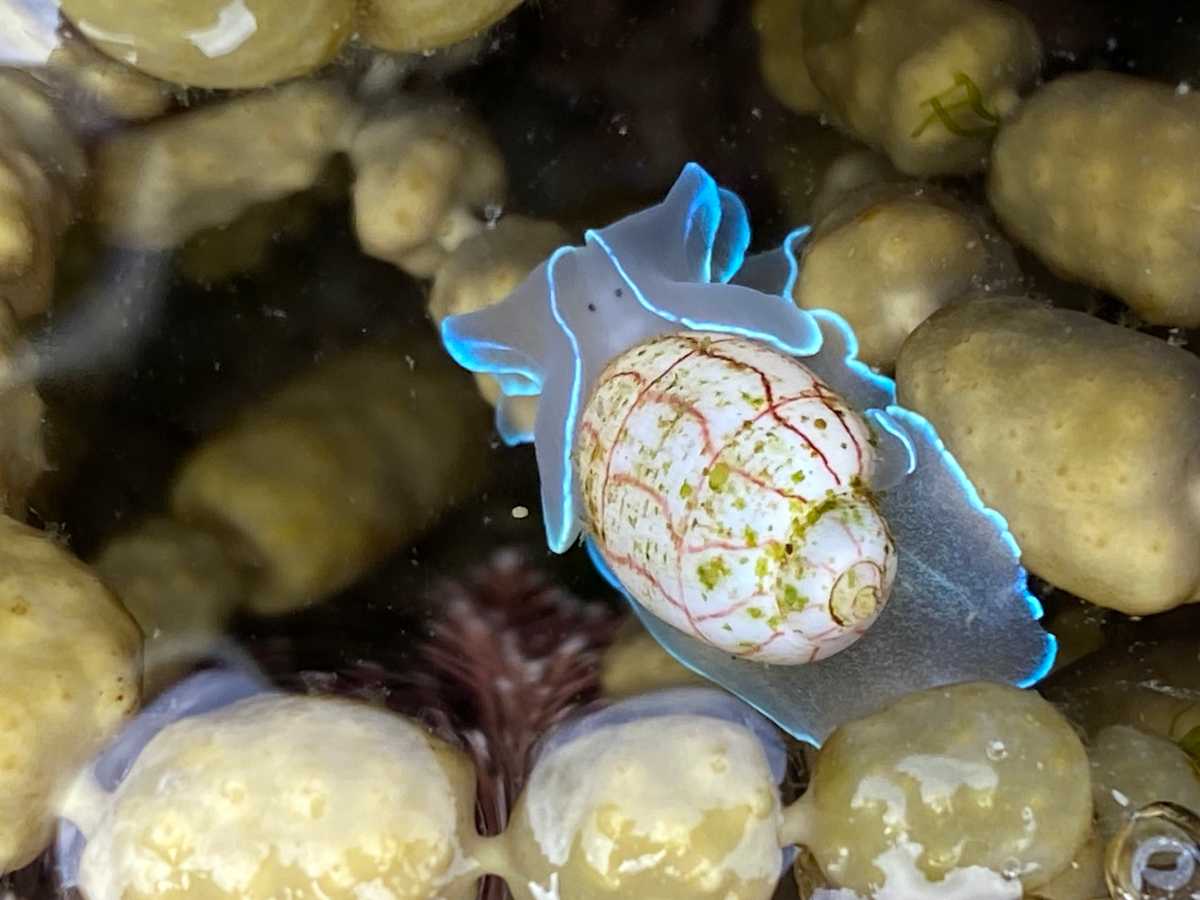 We also found several similar but even more beautiful Red-Lined Bubble Snails, much smaller at around 2cm in length and with the mantle outlined in this incredible iridescent blue. Like the Rose Petal, they have eye spots instead of complex eyes, which aside from looking comically adorable, help them detect light. Similarly they are both hermaphrodites, meaning they have both male and female reproductive organs. Once they mate, each snail can then go on to lay their own egg ribbons.