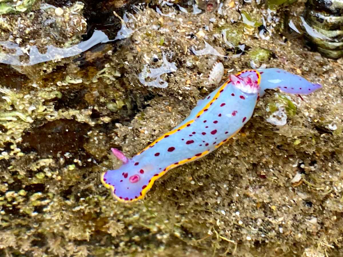 I was pretty excited, okay I squealed, as soon as I spotted the sky-blue body of the Bennett’s Sea Slug, its body dotted with red, its mantle a bright yellow. They can reach up to around 5cm in length but the ones I come across are usually smaller than this, a riot of colour, usually in the pools closer to the edge of the rock ledge.