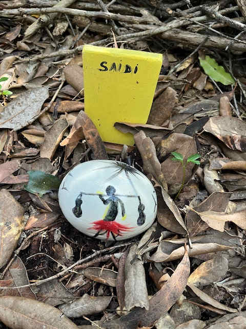 Banksia Bushcare is now exhibiting the Karecha and Saidi paintings transferred onto eggs for the enjoyment of those strolling through the Stanwell Avenue Reserve. They are part of the MATE Exhibitions (Modern Art Tributes on Eggs).