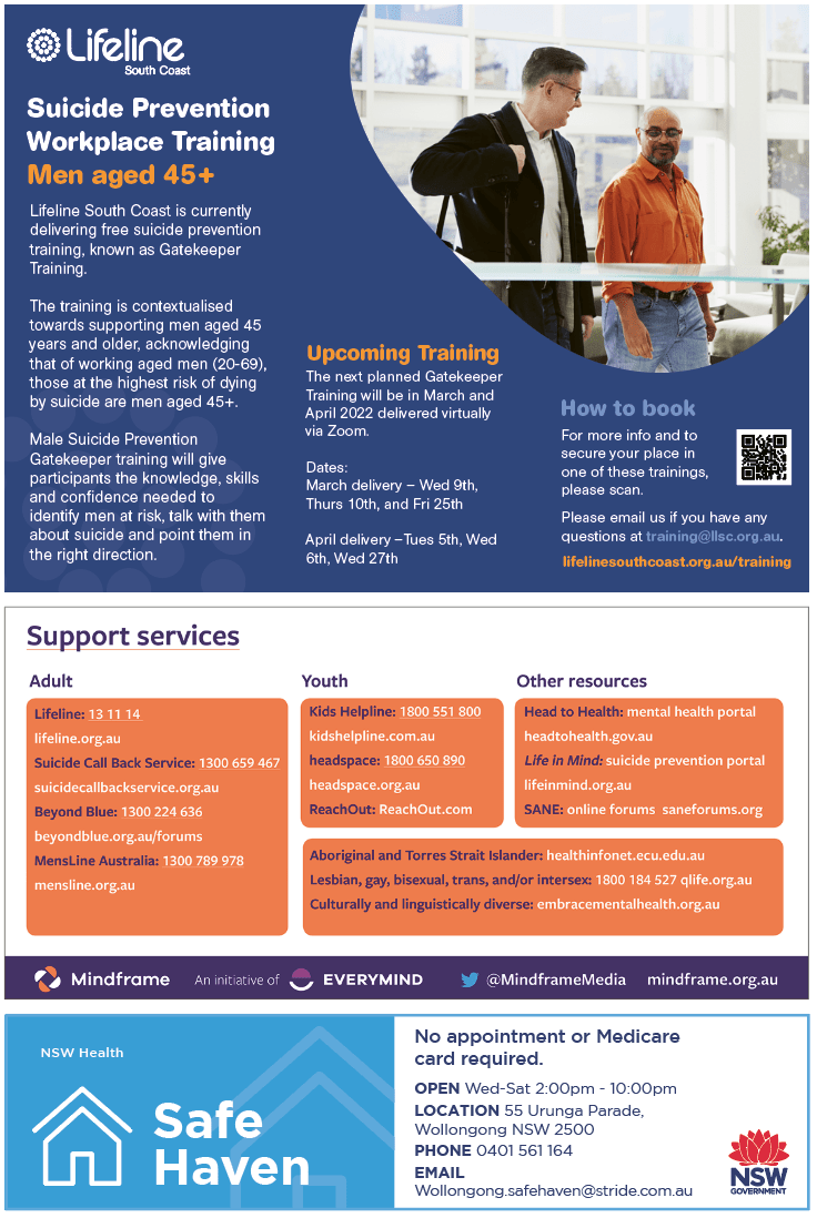 For 24-hour telephone crisis support, call Lifeline on 131 114. Bushfire Recovery line 13 help or 134 357. If life is in danger, call 000. Visit Lifelinesouthcoast.org.au