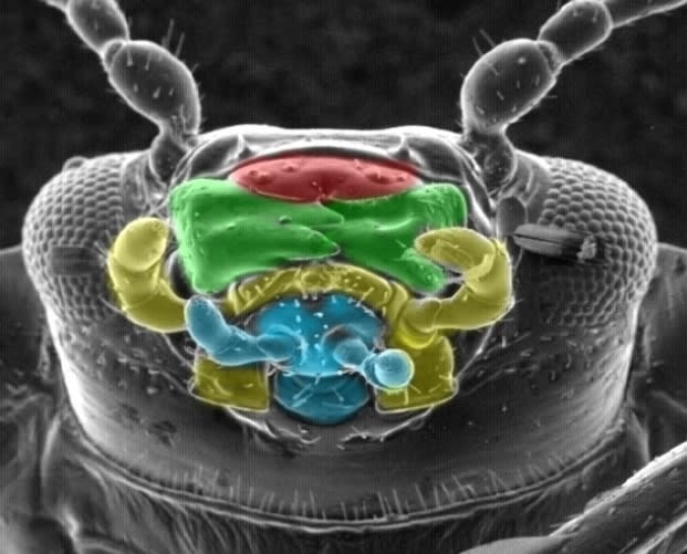 The important bits are green – these are the mandibles, which do the actual chewing, the other bits are for identifying and playing with the food.