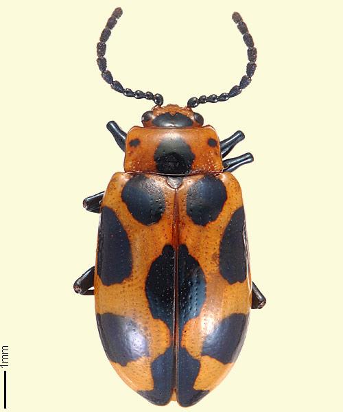 Not to be confused with another attractive beetle, Phola octodecimguttata [= 18 spotted phola], which feeds on Vitex trifolia, a garden plant from the subtropics which is planted here. Phola is a recent migrant to this area, not having been collected south of Lismore before 2005 and is only found in gardens, where Vitex is planted. These two species differ in their biology: Phola larvae construct a tube of their own poo as a daytime shelter in the twigs and feed at night, whereas Phyllocharis larvae are out on the leaves all day.