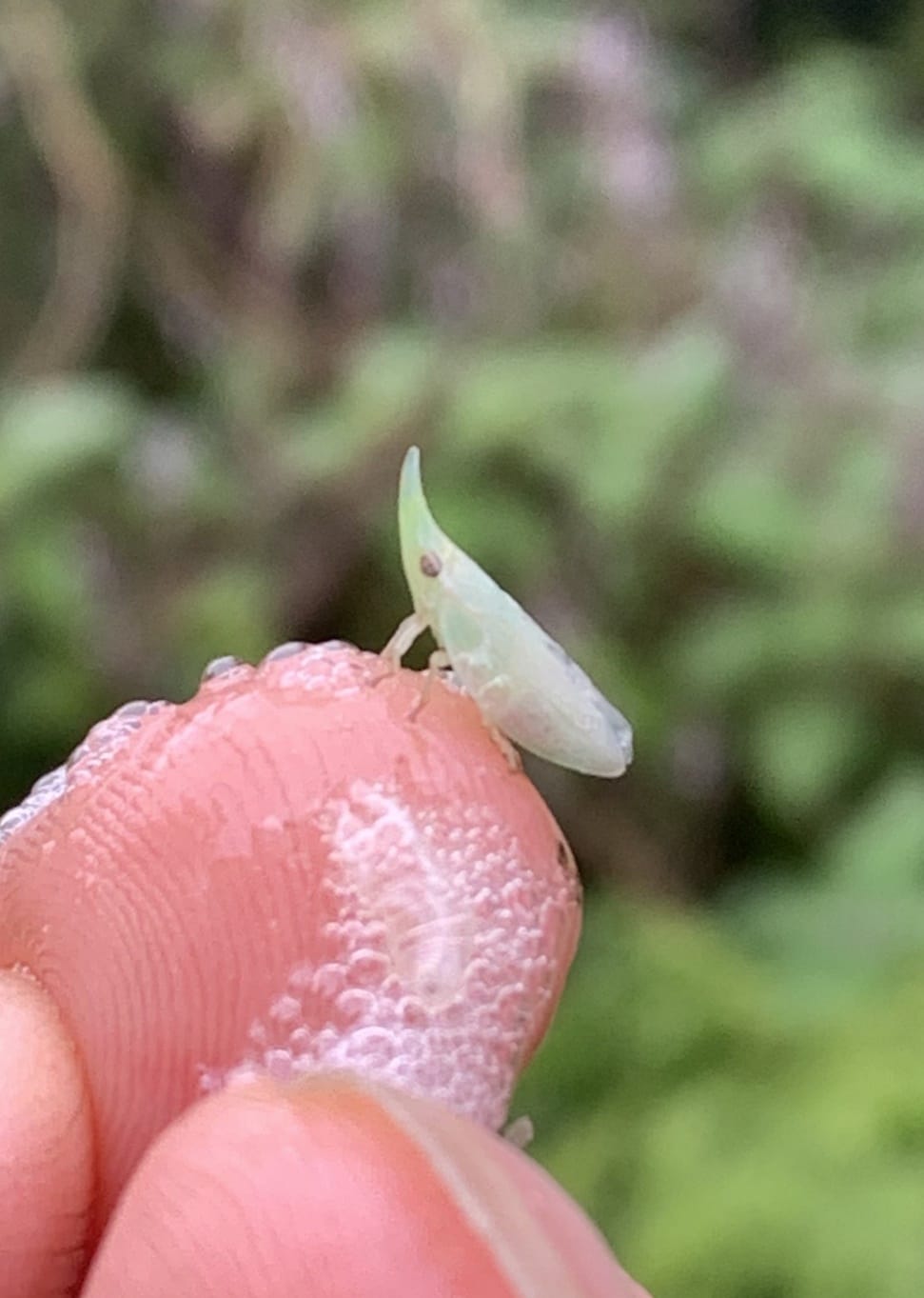 I’ve cleared away the froth of the left-hand blob (pictured at top of page) to reveal a young adult, still soft and almost colourless from its skin change. This would normally stop producing the spittle, then dry out to a brown spittlebug with dark wing bands.