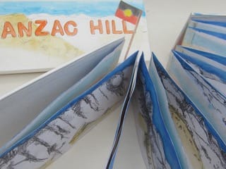 Clockwise from top left: Anita Johnson’s Workbook, Judy Bourke’s Anzac Hill, Liz Jeneid’s Reconciliation books (2 of 25), Kathryn Orton’s Auburn Street (Goulburn) and Lucia Parrella’s Written on Oak Leaves