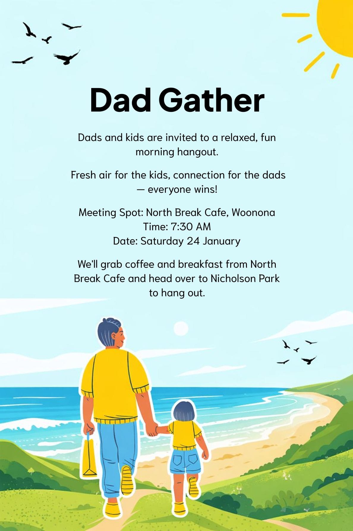 The next Dad Gather will be on Saturday, February 14 at 7.30am at Thirroul Beach. If you're interested to know more, you can request to join the Dad Gather private Facebook group.