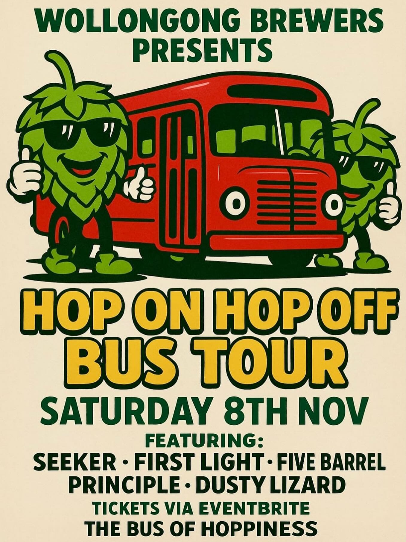 The Bus of Hoppiness, organised by the Wollongong Brewers Association, will run between 12pm and 6pm tomorrow, taking ticket-holders to Unanderra’s Seeker Brewing, Wollongong’s Five Barrel Brewing and Dusty Lizard Brewing, Coniston’s First Light Brewing, and Principle Brewing in Fairy Meadow. The "Hop-On, Hop-Off" bus will run on a loop between the venues about every 45 to 60 minutes.
