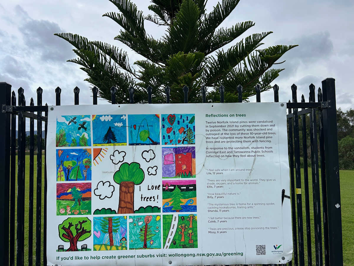 This is the third tree vandalism attack in Towradgi in the past five years. Previously Council expressed its concern when trees near the cycleway were poisoned. Local schools showed their love for the trees with special pictures and words for Council signage.