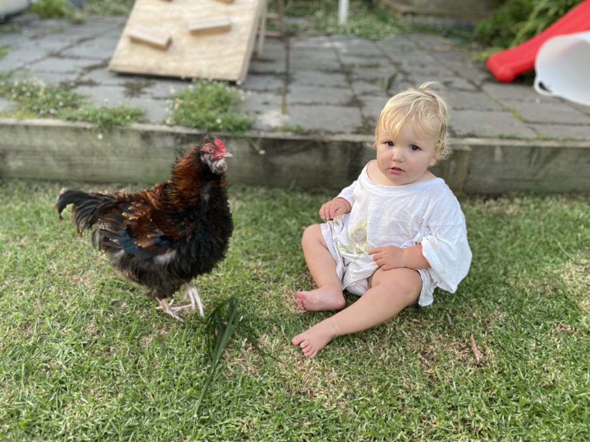 Unfortunately, Bobbi Toffee turned out to be a rooster. And despite his loving upbringing, he became a VERY aggressive rooster. Roosters are not permitted to be kept in Wollongong suburbia due to the noise pollution created from their crowing. So, Bobbi Toffee had a lovely 18 months of life with us before he attacked the baby and signed his own vacating notice. Not before he had the chance to sire a clutch of new chickies for the girls to cuddle!