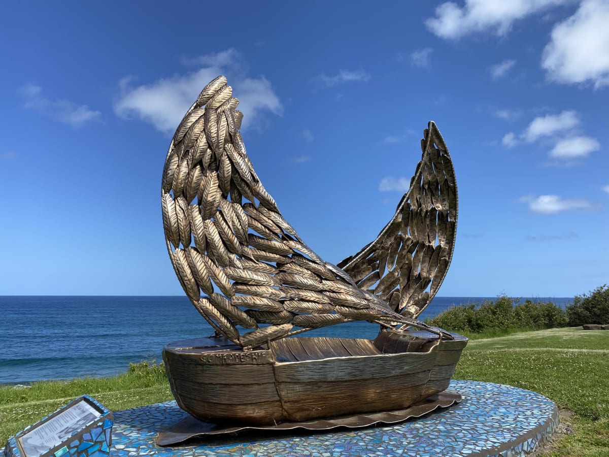 Comradeship is a whimsical, almost childlike work. Fashioned from recycled stainless steel, it’s about the height of an adult. Approaching from the west with the ocean beyond, a silver dingy with two full sails appears to be making its way at a rakish angle across the water. The craft is being propelled impossibly by two winds, the sails are billowing in opposite directions. Didier said that he was inspired by stories of Mike, “He was everywhere at once.”