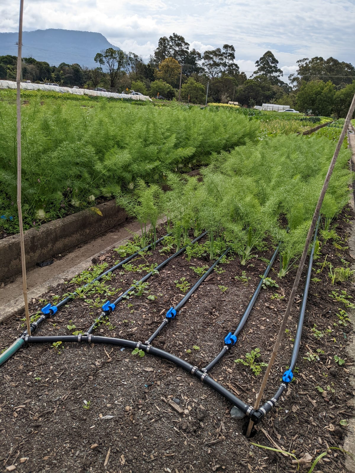Frank adopted a no-dig garden approach, building up the plots with organic matter rather than digging and turning the soil. He adds organic fertiliser to give the plants the best chance initially but eventually, he says, the soil health takes over. He installed an irrigation system fed by water tanks that collect rainwater and are supplemented by the local creek, Mullet Creek. This system allows him to control the amount of water the crops receive.
