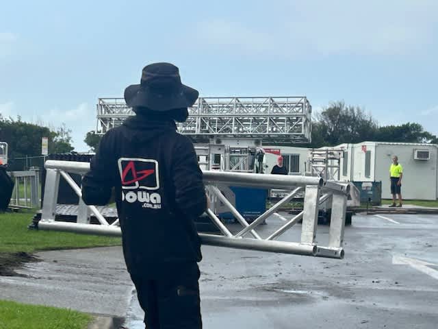 This morning the bump-in was well underway in drizzly conditions at Thomas Dalton Park just 48 hours from the first acts taking to the stage.