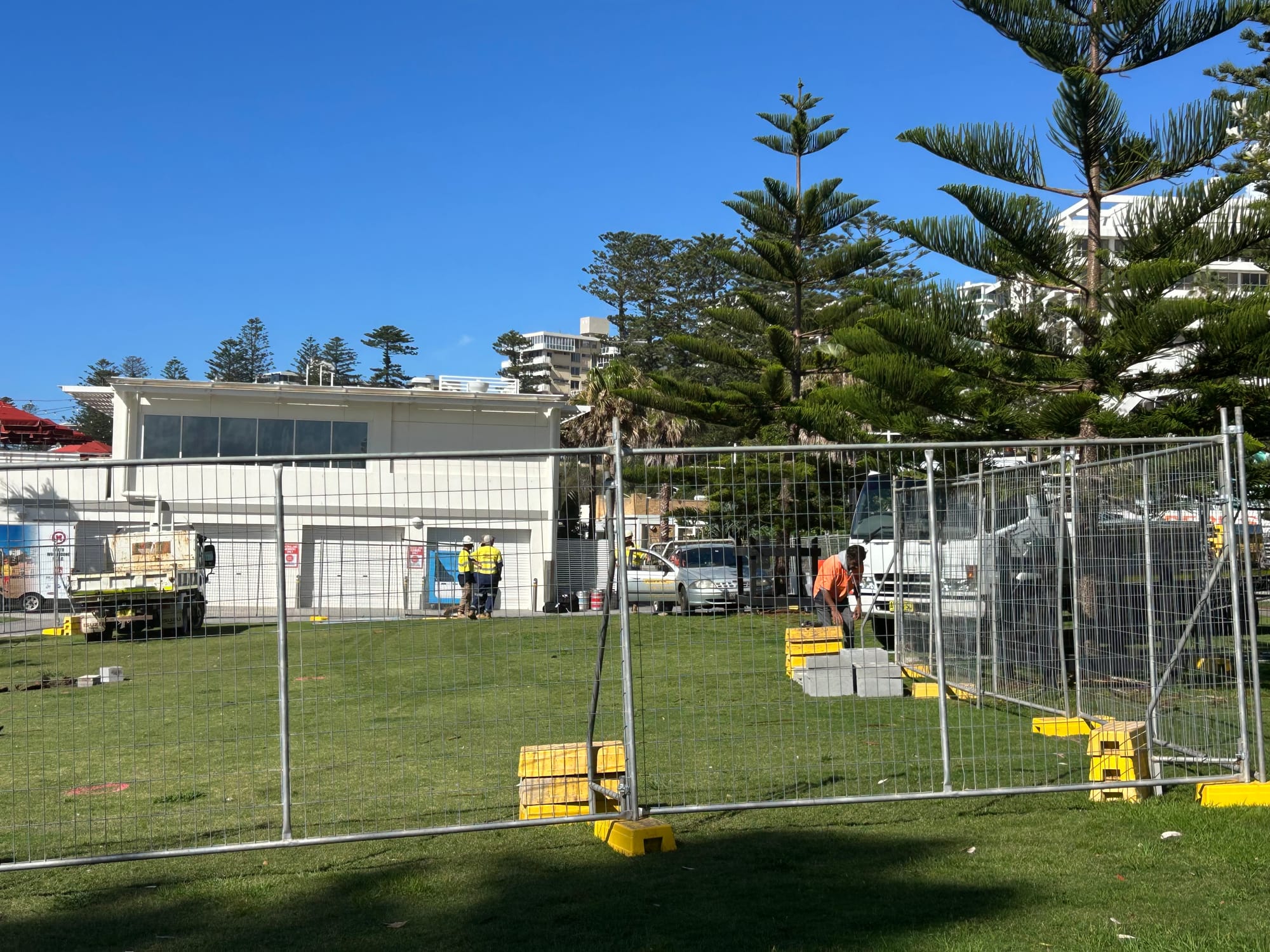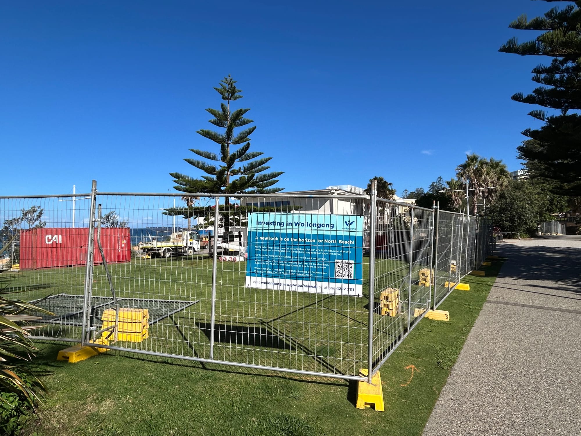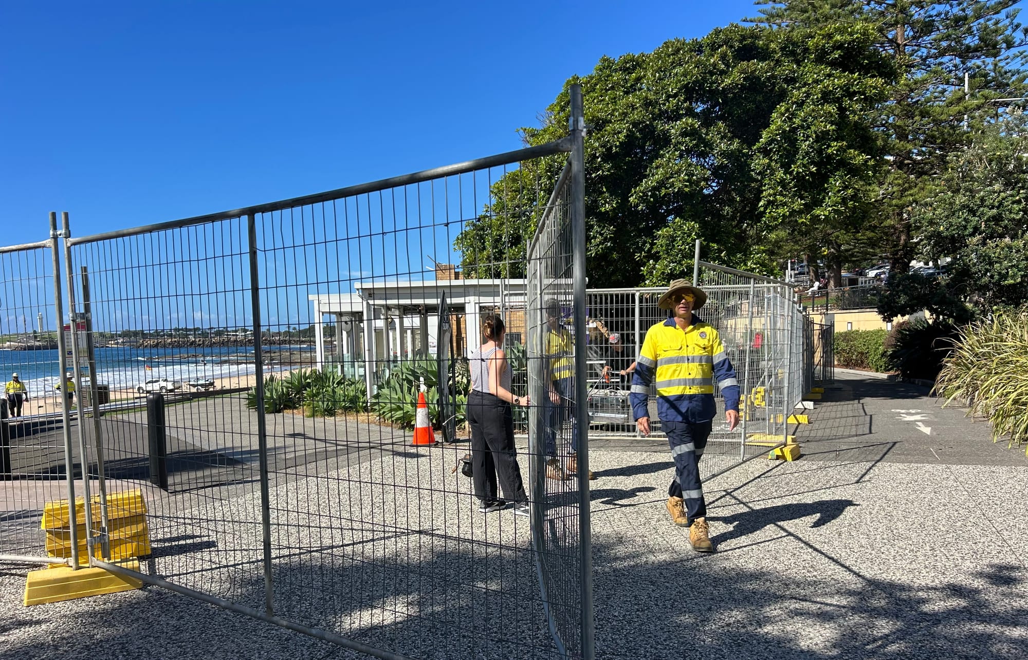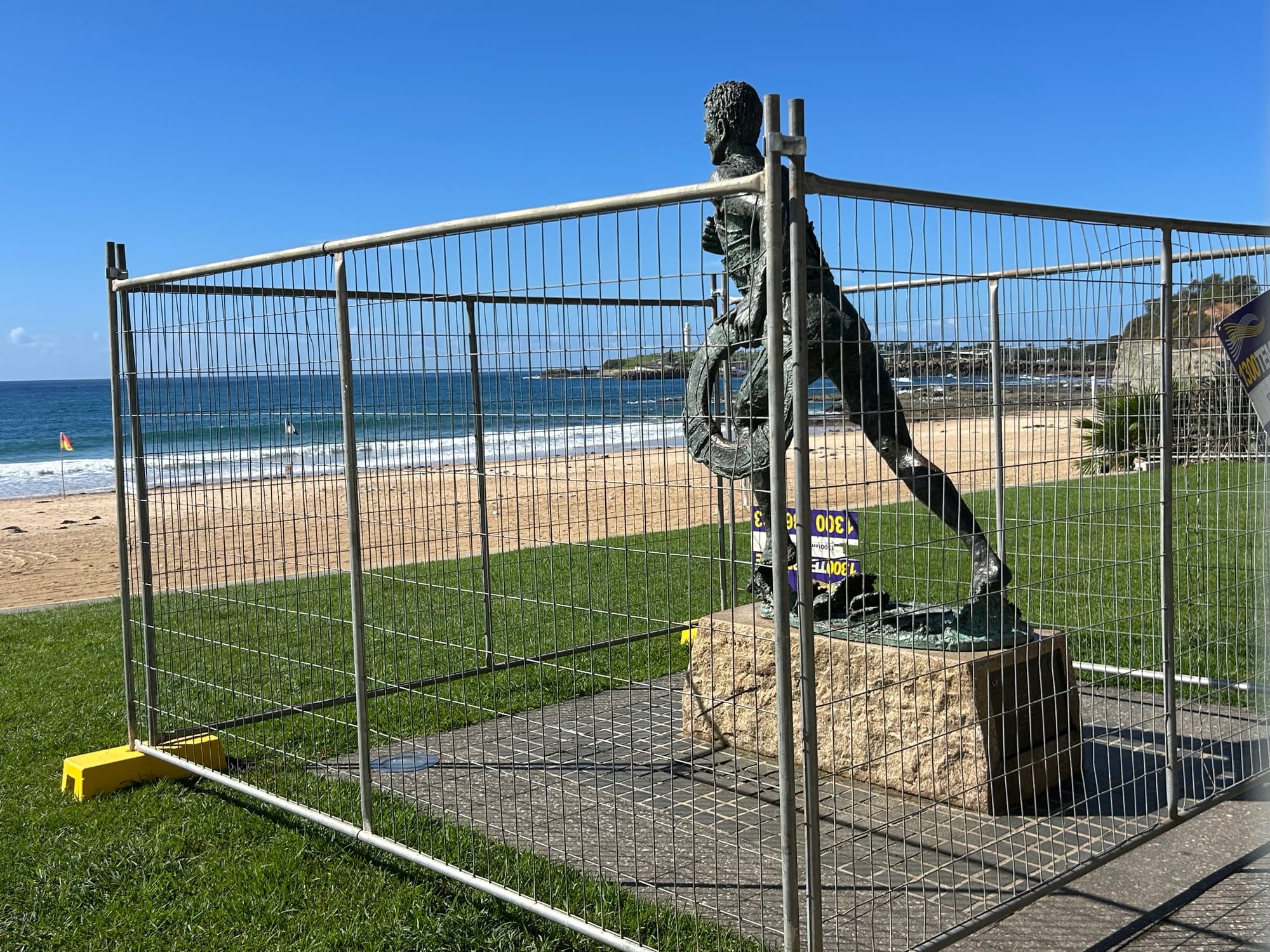 Over the past 48 hours, large areas in the precinct have been fenced off. Popular grassy areas between the kiosk and the Pavilion cafe are now out of bounds. There’s been extra fencing put in place to protect the sculptural tribute to the North Wollongong Surf Life Saving Club.