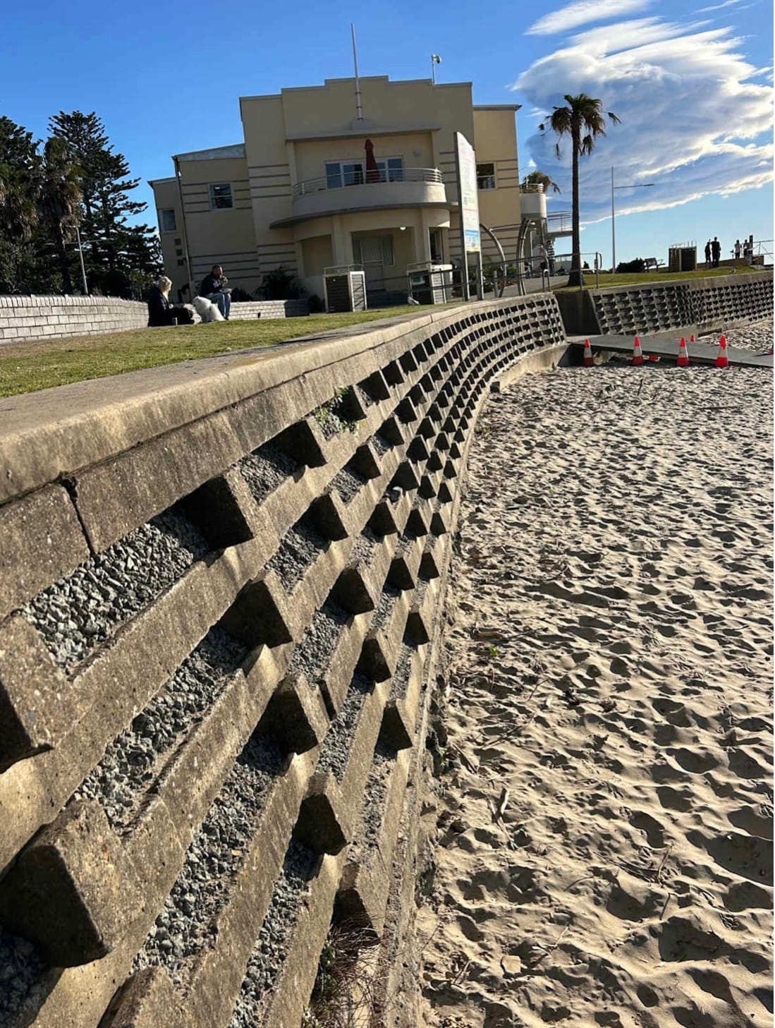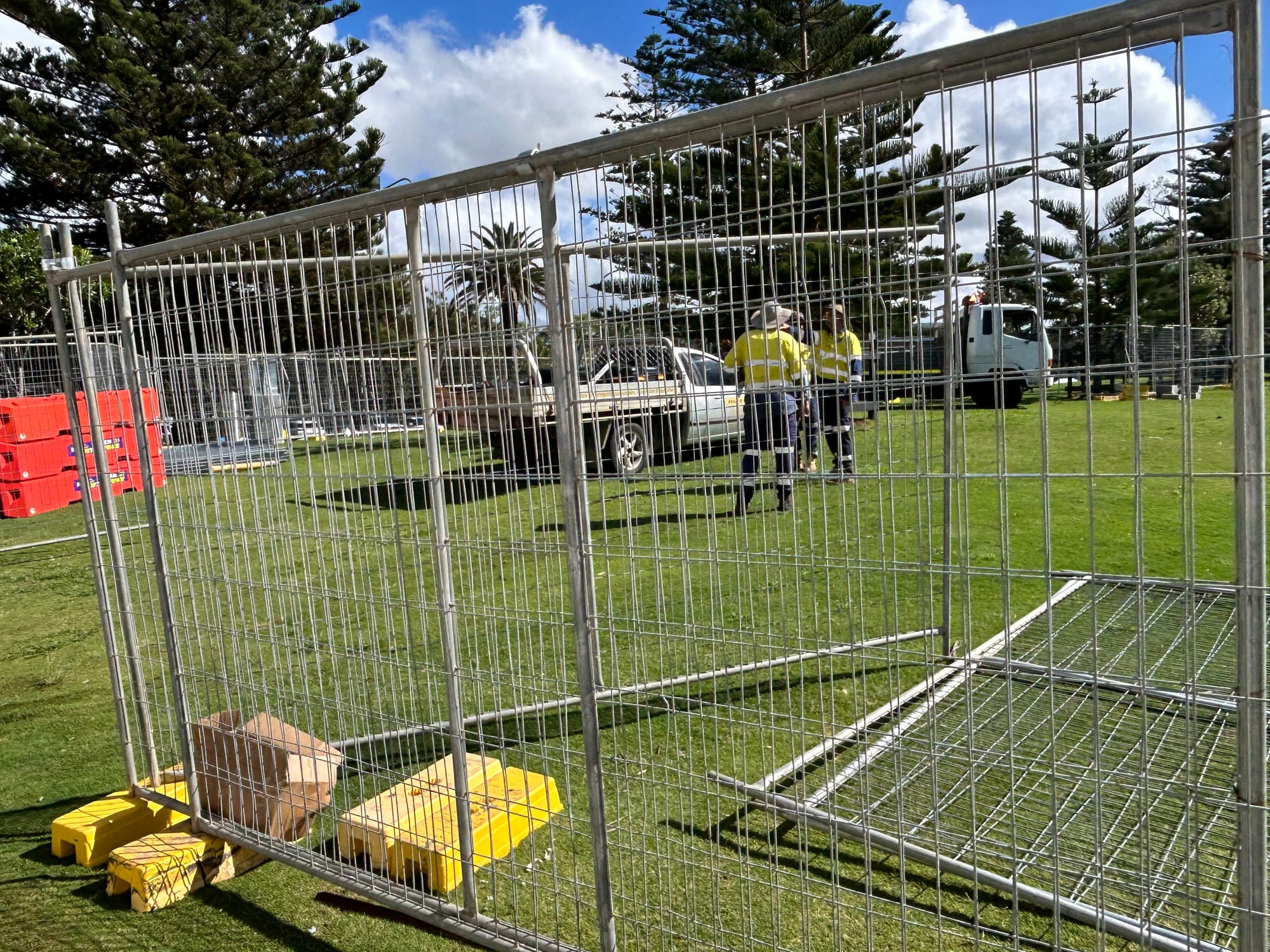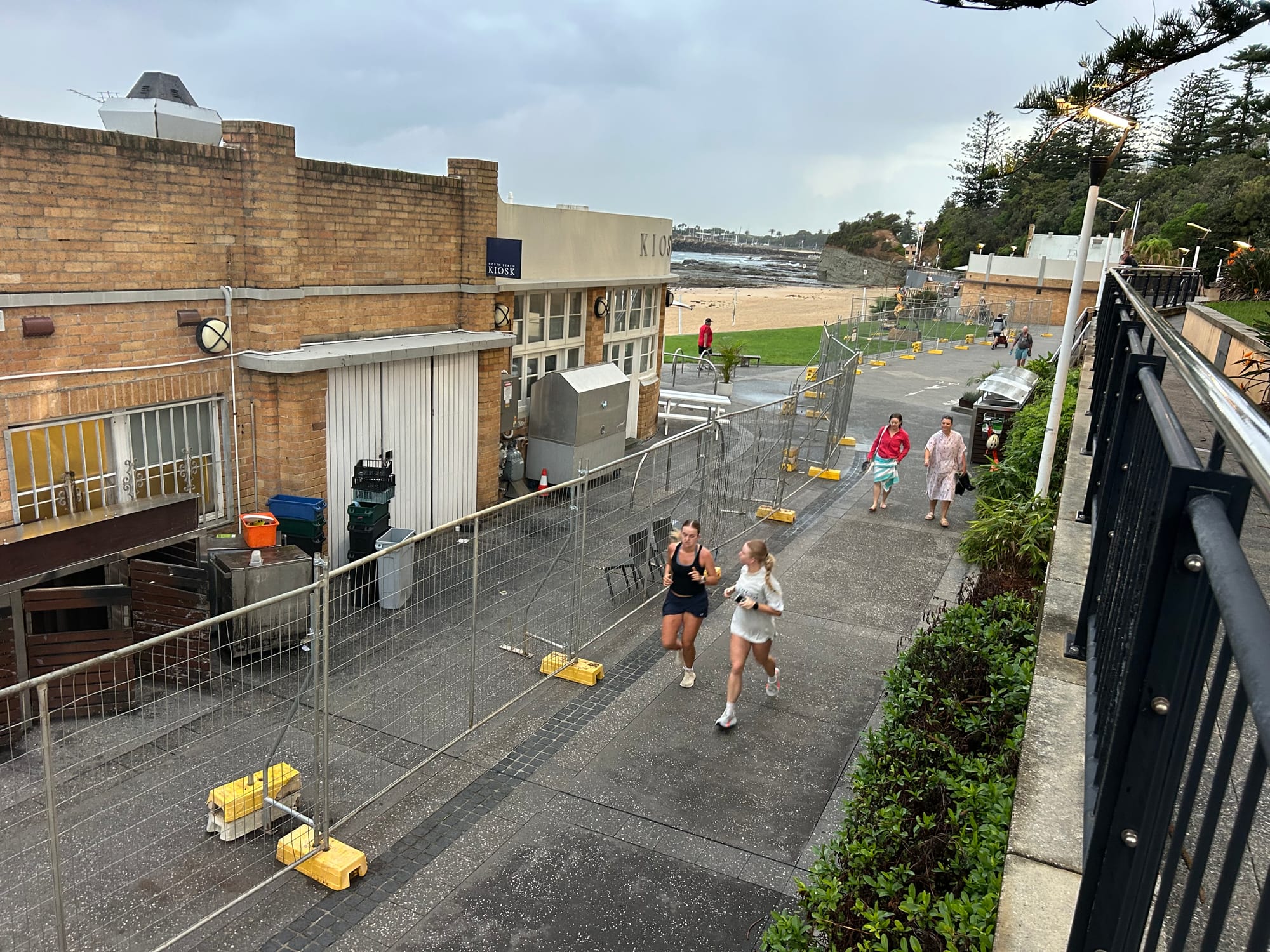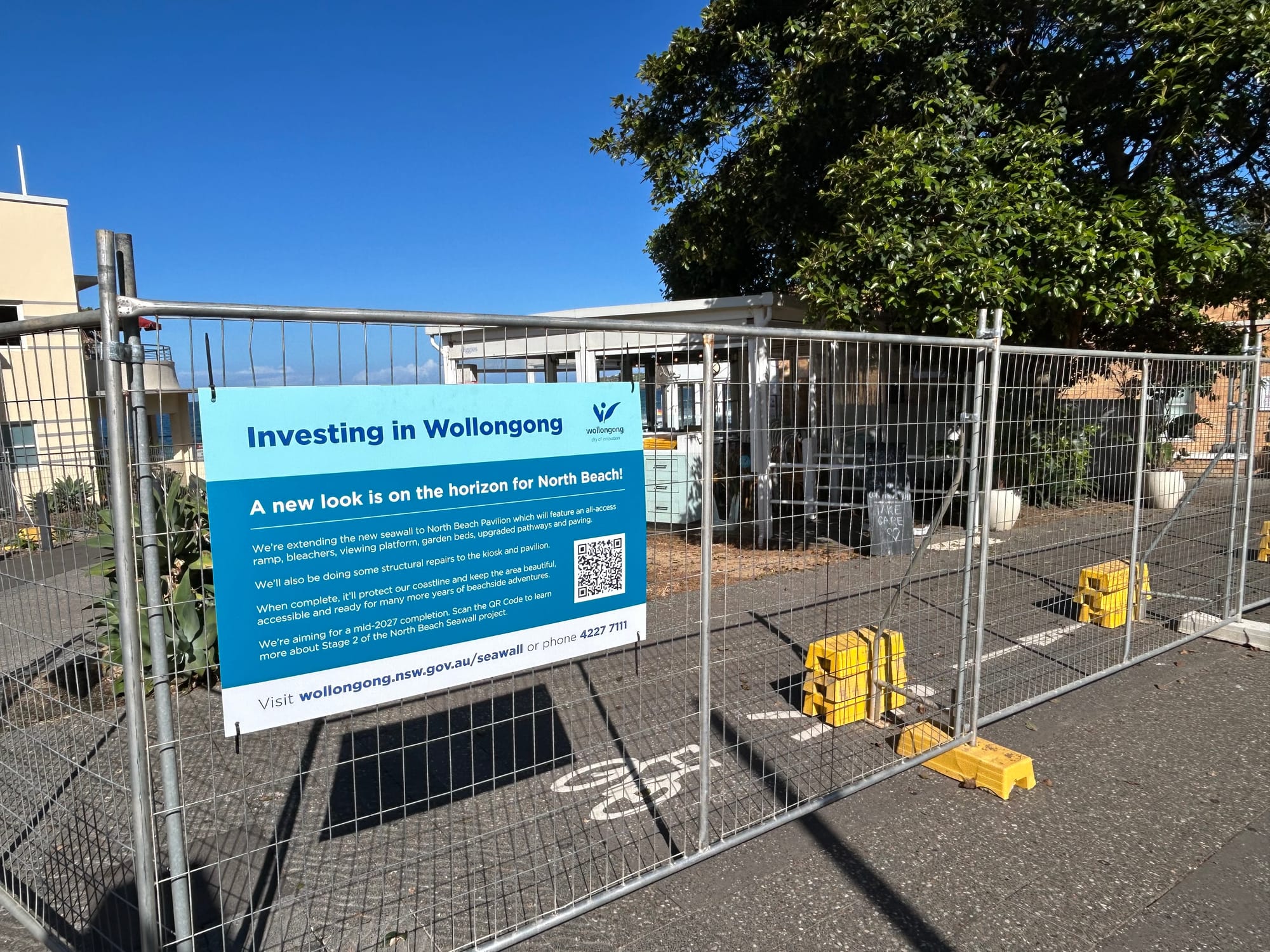 Over the past 48 hours, large areas in the precinct have been fenced off. Popular grassy areas between the kiosk and the Pavilion cafe are now out of bounds. There’s been extra fencing put in place to protect the sculptural tribute to the North Wollongong Surf Life Saving Club.