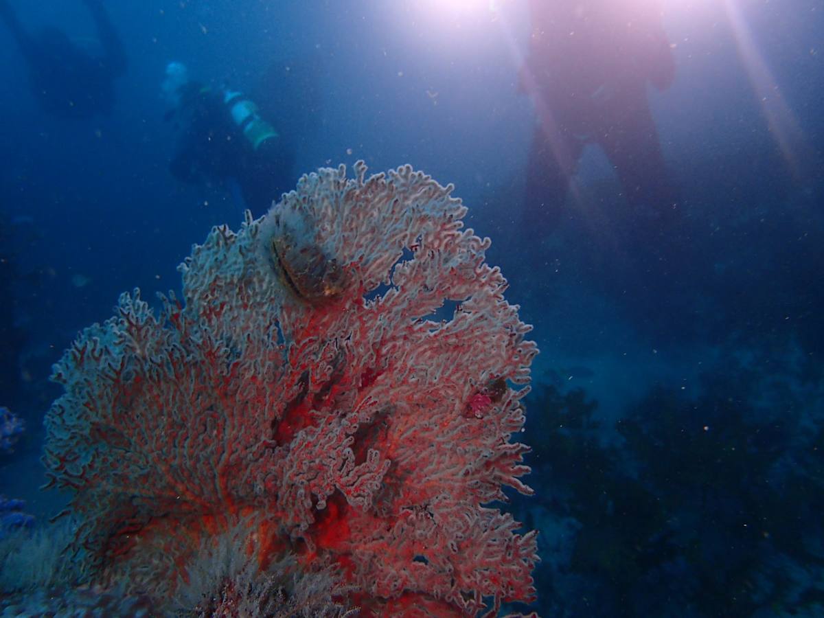 Melithaea zimmeri is a kind of Gorgonian or “fan coral” (pictured at top). Branches fan out from flexible nodes on a central “trunk”, so these soft corals look like bushes exploding against the blue ocean in vivid reds and oranges. Their spectacular appearance makes them popular subjects for underwater photography and distinctive landmarks for navigating dive sites. Like many corals, they are also popular habitats for small fish, as their intricate structures offer protection from predators.