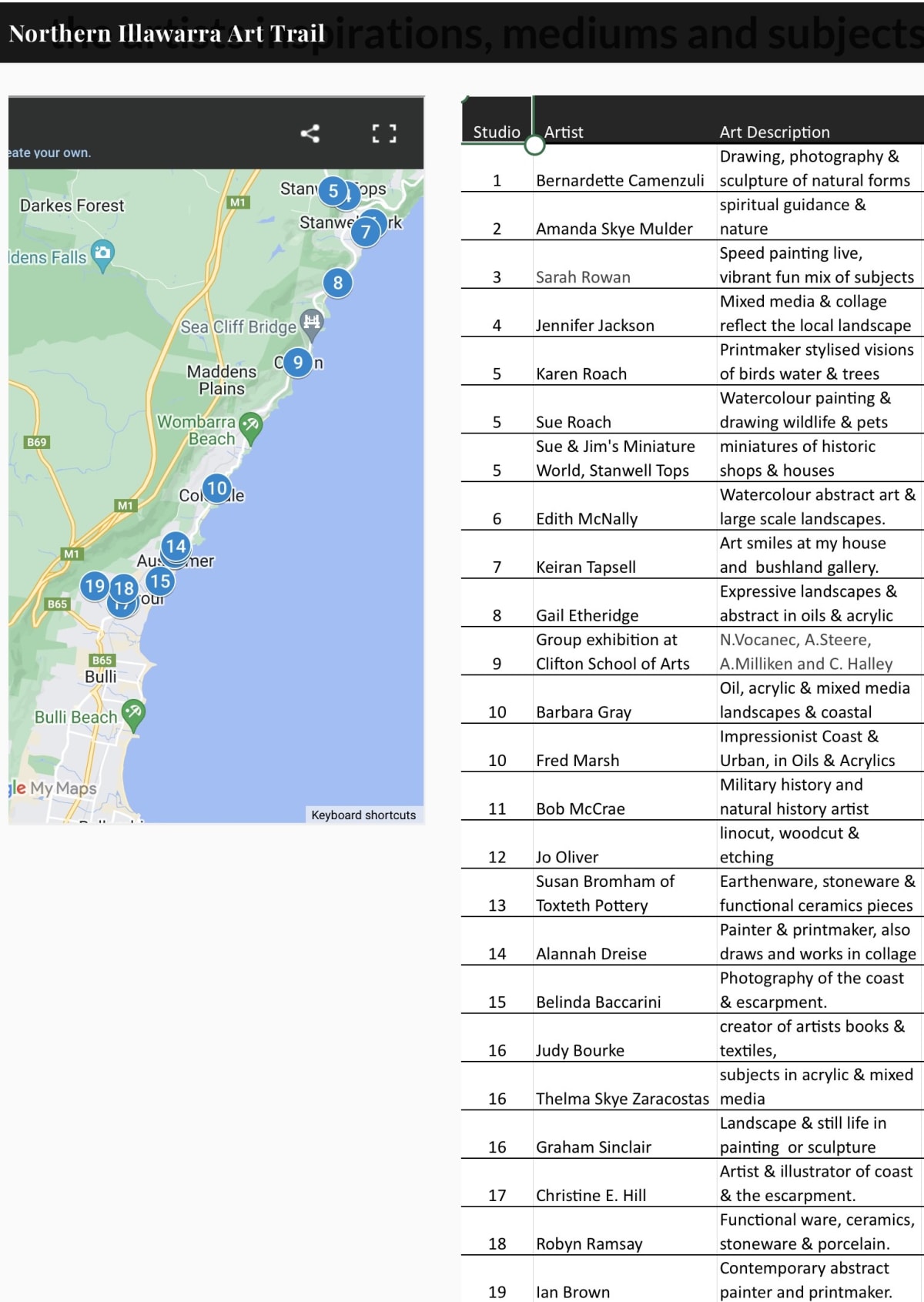 Artists of the Illawarra have powered ahead with the support of Wollongong City Council to create an inaugural “Northern Illawarra Art Trail” (NIAT) on the weekend of November 19 and 20. More than 20 local artists will open their studios so that anyone and everyone can come and see what they do and how they do it.