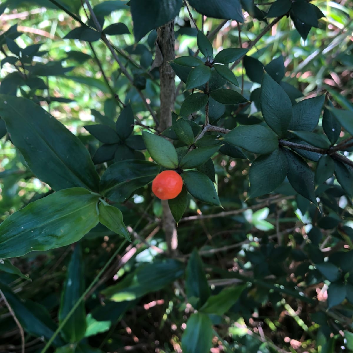I don't know which species eat its stunning orange fruit, but they look pretty tempting to me. The plant below is in my garden and this is its very first, solitary, fruit. Established plants in natural areas are known to produce 'chains' or 'strings' of fruit like a series of Jaffas. Based on my garden experience, I reckon they would be very appealing to King Parrots and Satin Bowerbirds. I'd be very interested to hear about others' experiences with this plant in garden settings.