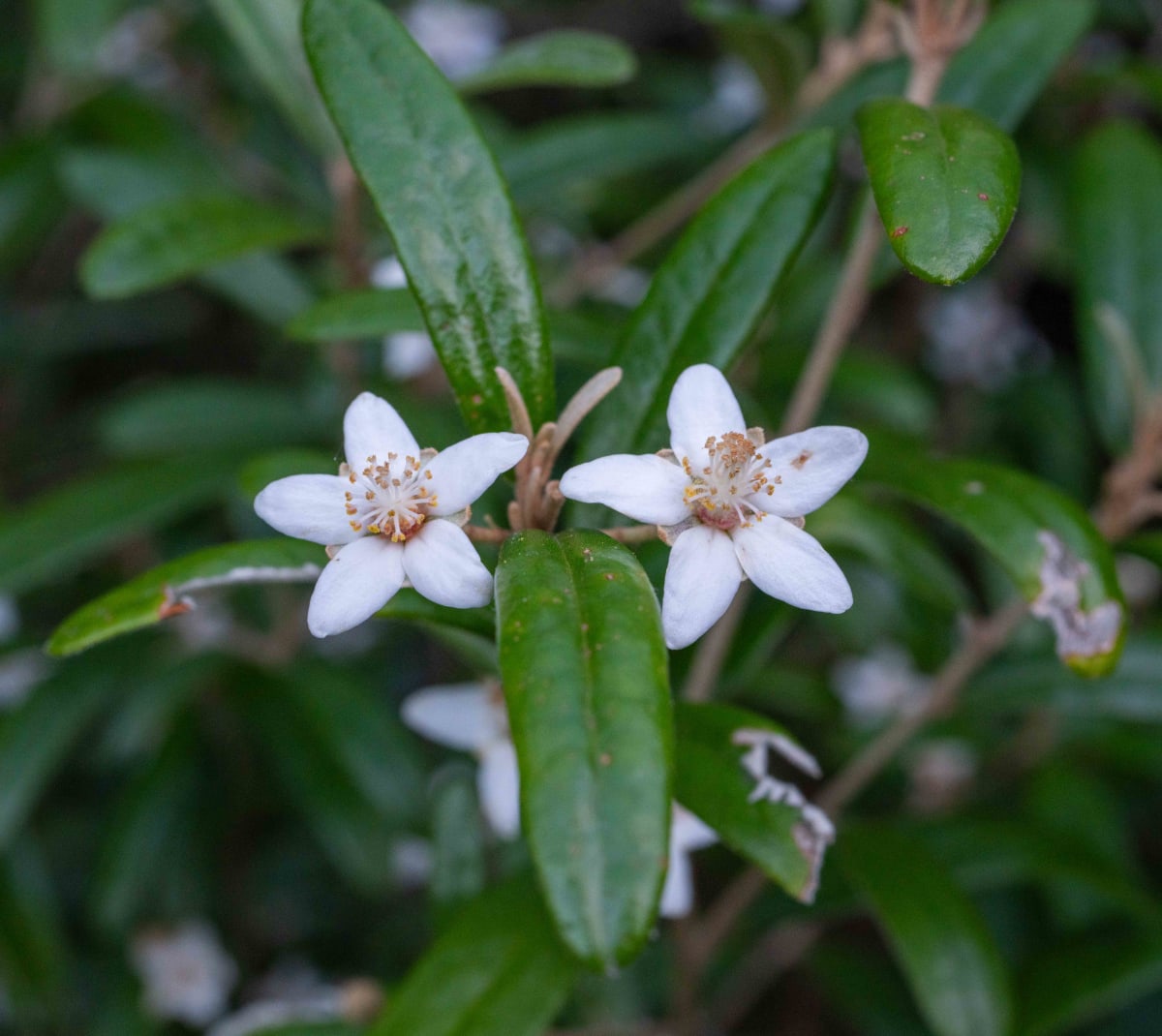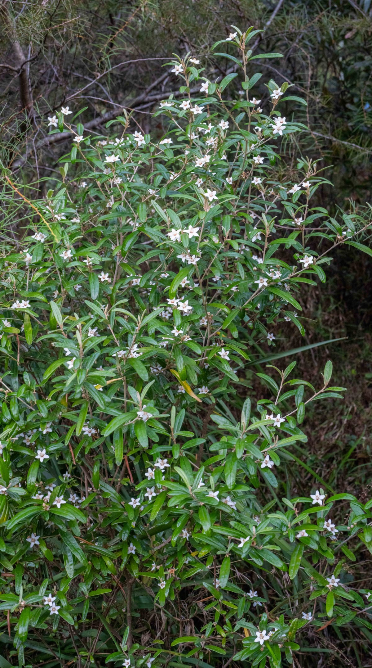 Its relative, the Wedding Bush (Ricinocarpos pinifolius), is very common in cultivation, and known for its pretty white flowers, but the Springbrook Wedding Bush's flowers are larger and have a bit more colour to them too. And while regular Wedding Bush grows in coastal heath on sand dunes or on sandstone-derived soils, Springbrook Wedding Bush is a more adaptable species and can cope with a fairly wide range of habitats and conditions.