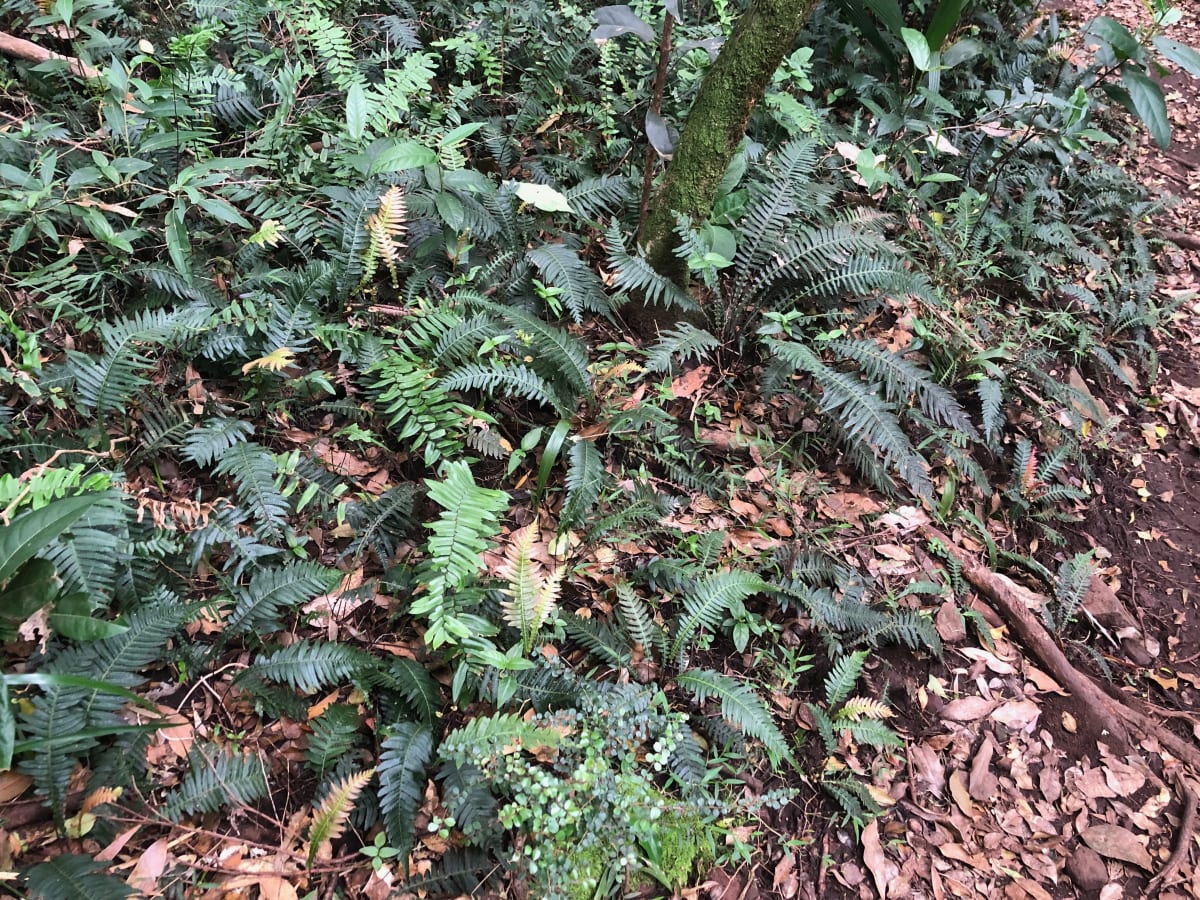Prickly Rasp Fern fronds aren't really prickly, though I guess you could call them rough because they are covered in small tubercles (aka lumpy bumpy warty bits). Even when the new growth isn't in full colour, their very dark greens make this species a distinctive element in the forest understorey. They also grace many local gardens, turning up uninvited in spots that suit them. In turn, they provide habitat for small lizards and frogs, which like to shelter among the fronds.