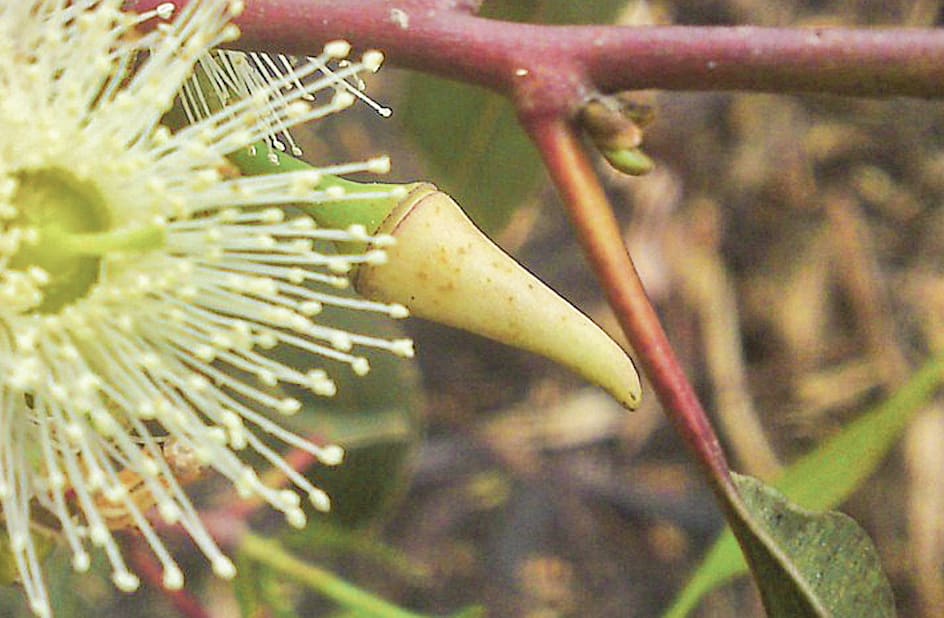 One special feature of eucalypts is the bud cap (or calyptra) that is part of the developing flower bud. In Forest Red Gum, the bud cap is conical, long and pointed, like a witch's or wizard's hat. If you want to get to know the local eucalypts, the details of the buds and bud caps are worth knowing. If you're not that fussed, they're still a really interesting feature, and fallen bud caps can often be seen below local eucs during their flowering period.