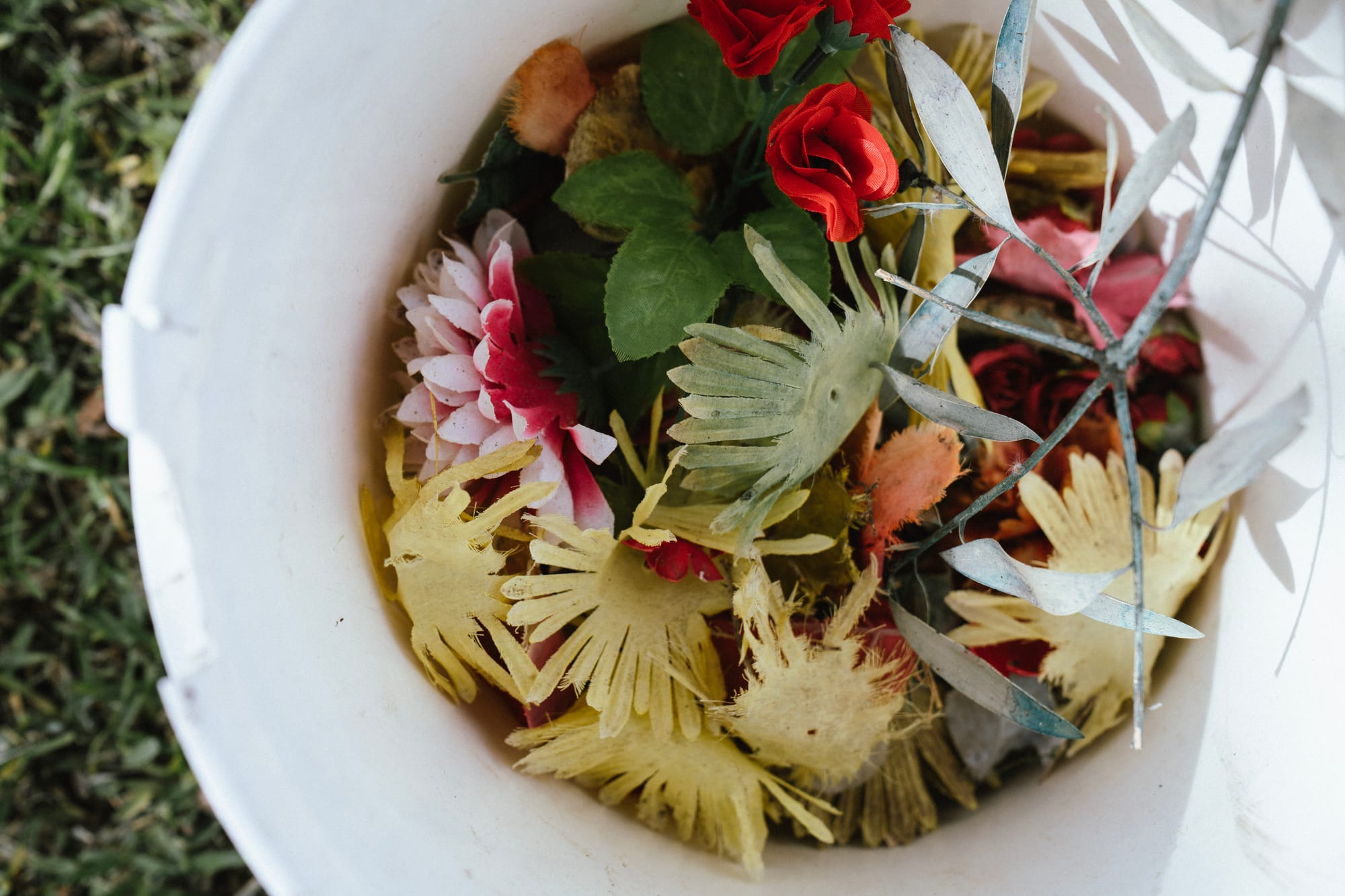 Emma Rooksby of Growing Illawarra Natives demonstrates how best to plant tubestock. At right: A bucket of plastic flowers picked up before planting at the Friends Plot, Wollongong Cemetery. Photos: Billie Acosta, 2025