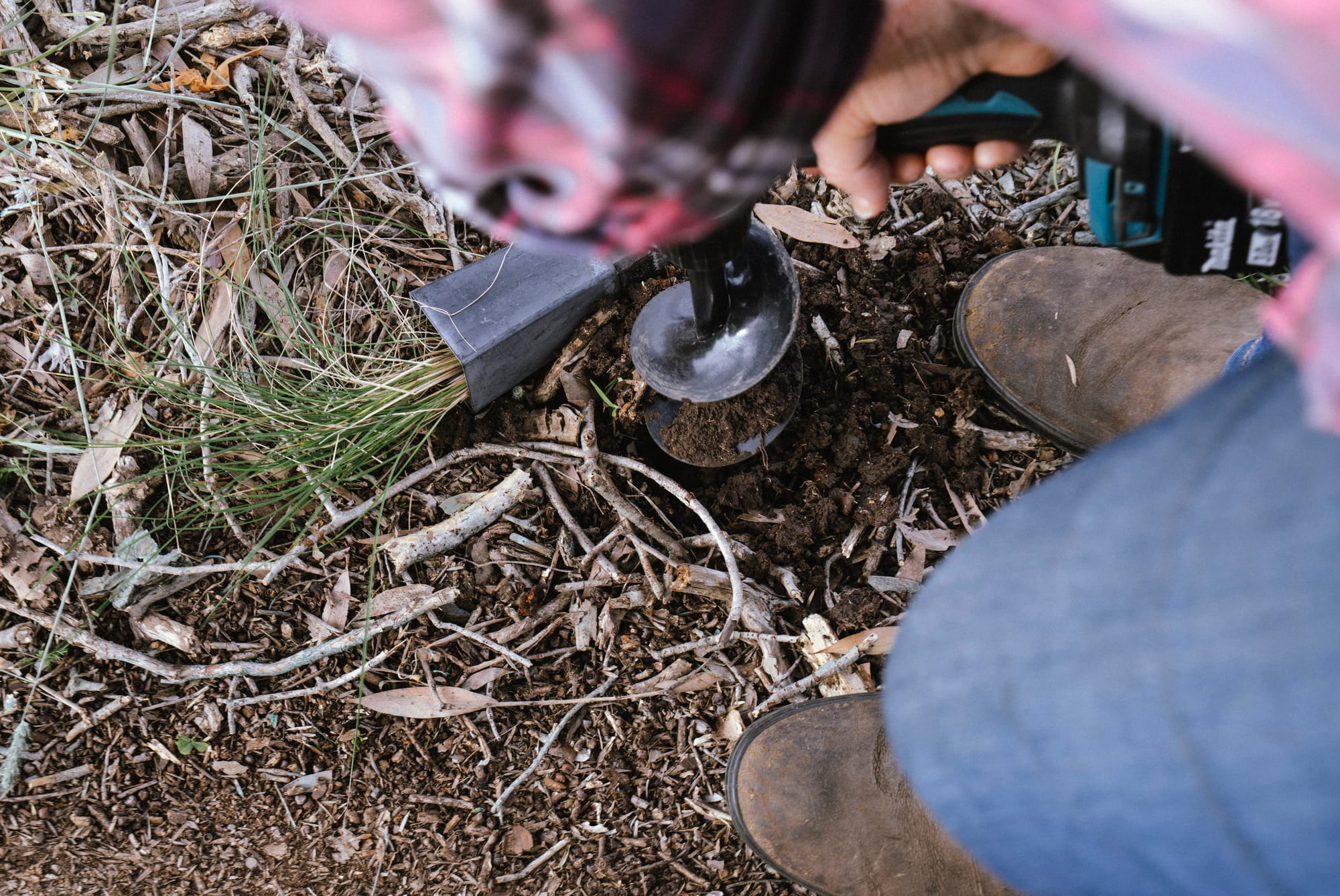 Typical maintenance involves mowing and herbicides, which exhaust and deplete the landscape. Photo: K. Morgan, 2025. At right: Janine uses a drill auger to create holes just big enough for tube stock. Photo: Billie Acosta, 2025