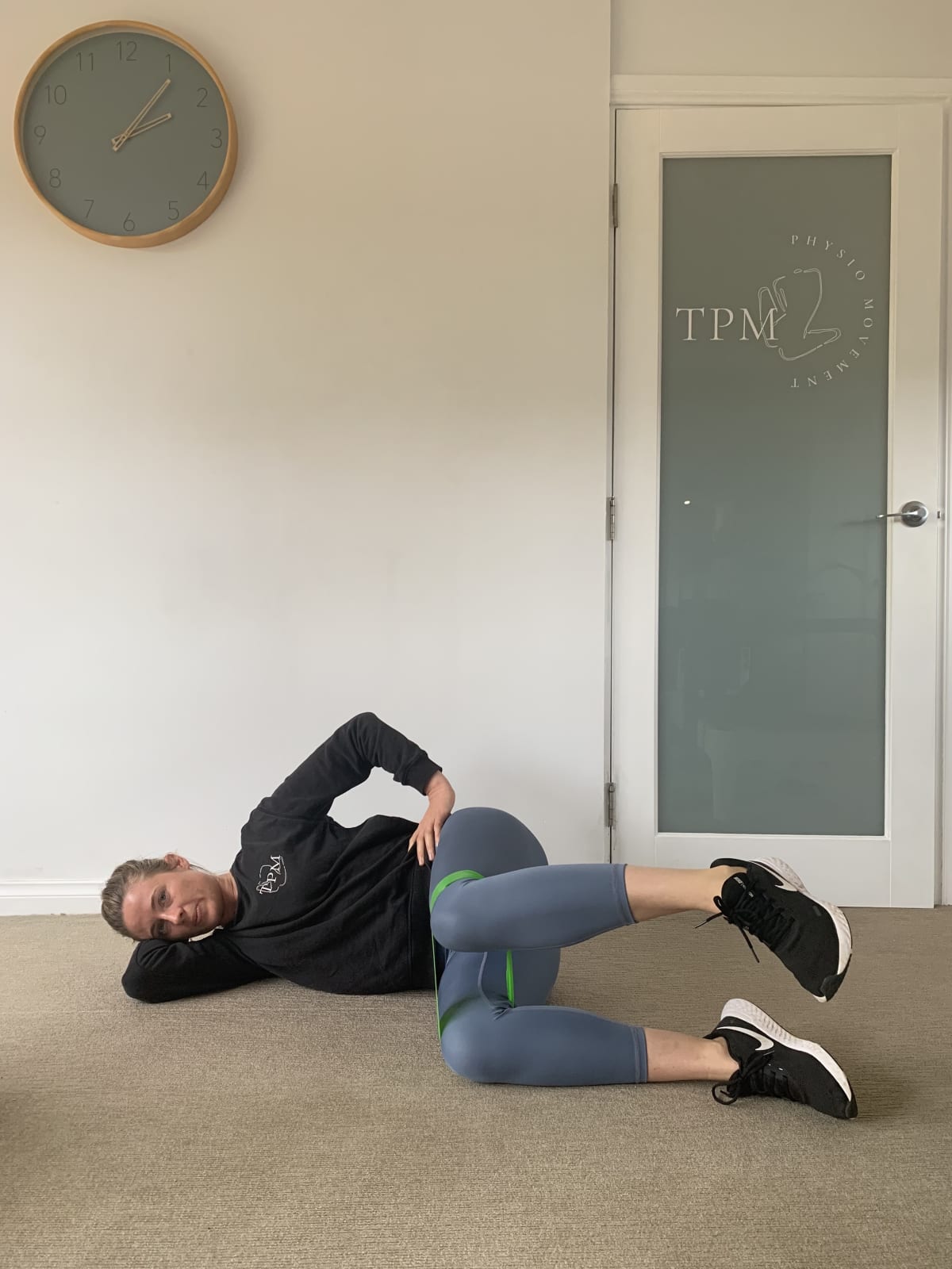 Lie on your side with a TheraBand around your knees. Start by lifting the top shin, keeping the shin parallel to the ground x10. Next, keep the top knee lifted as you squeeze your top heel down into the bottom heel x10. Next, keep that top shin lifted as you stretch your leg backwards x10.