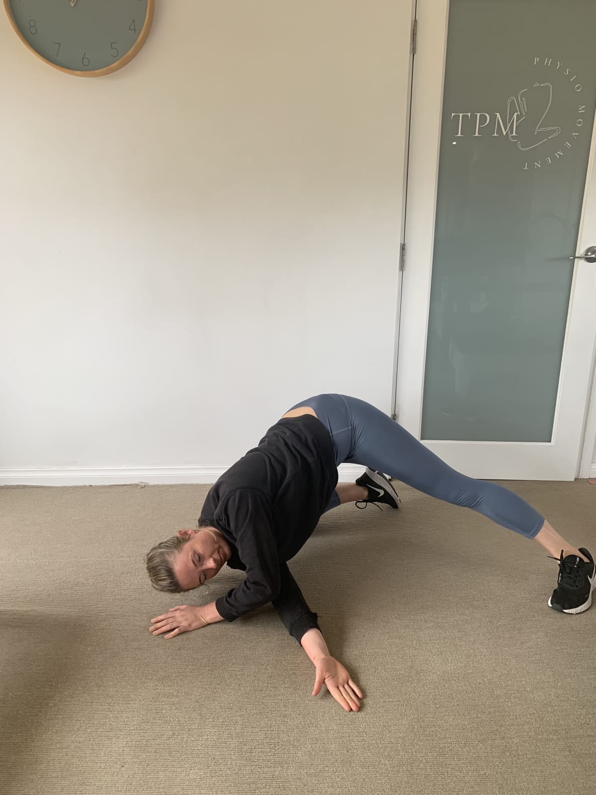 As above, but with your right leg out to the side. Repeat with left leg out to side and left arm reaching through to right. 6 reps per side.