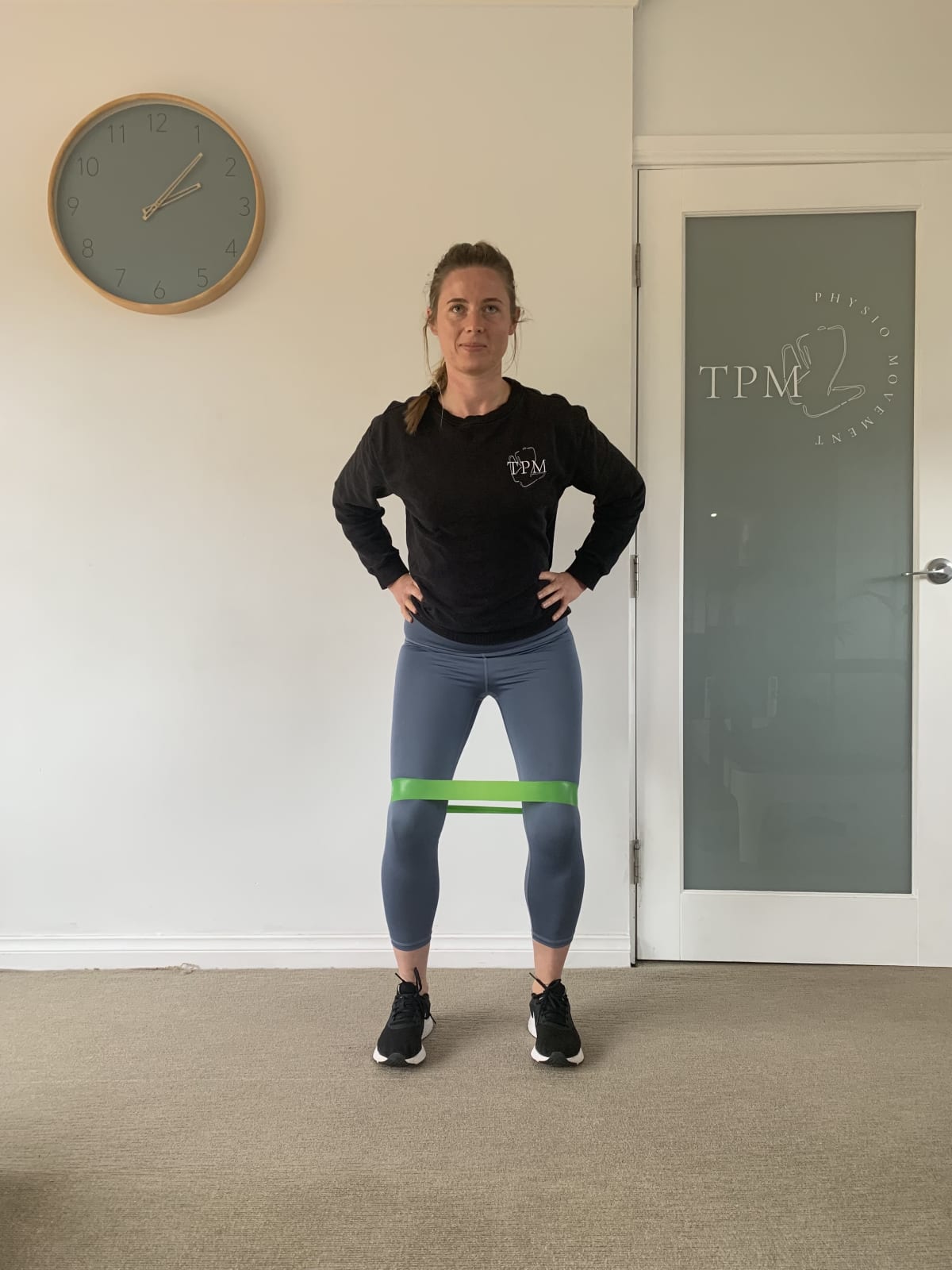 Stand with your feet slightly parted and the TheraBand around your knees. Think of the weight being even in big toe, little toe and heels. Keep tension on the band and knees as wide as the feet as you bend into a squat. Repeat x20.