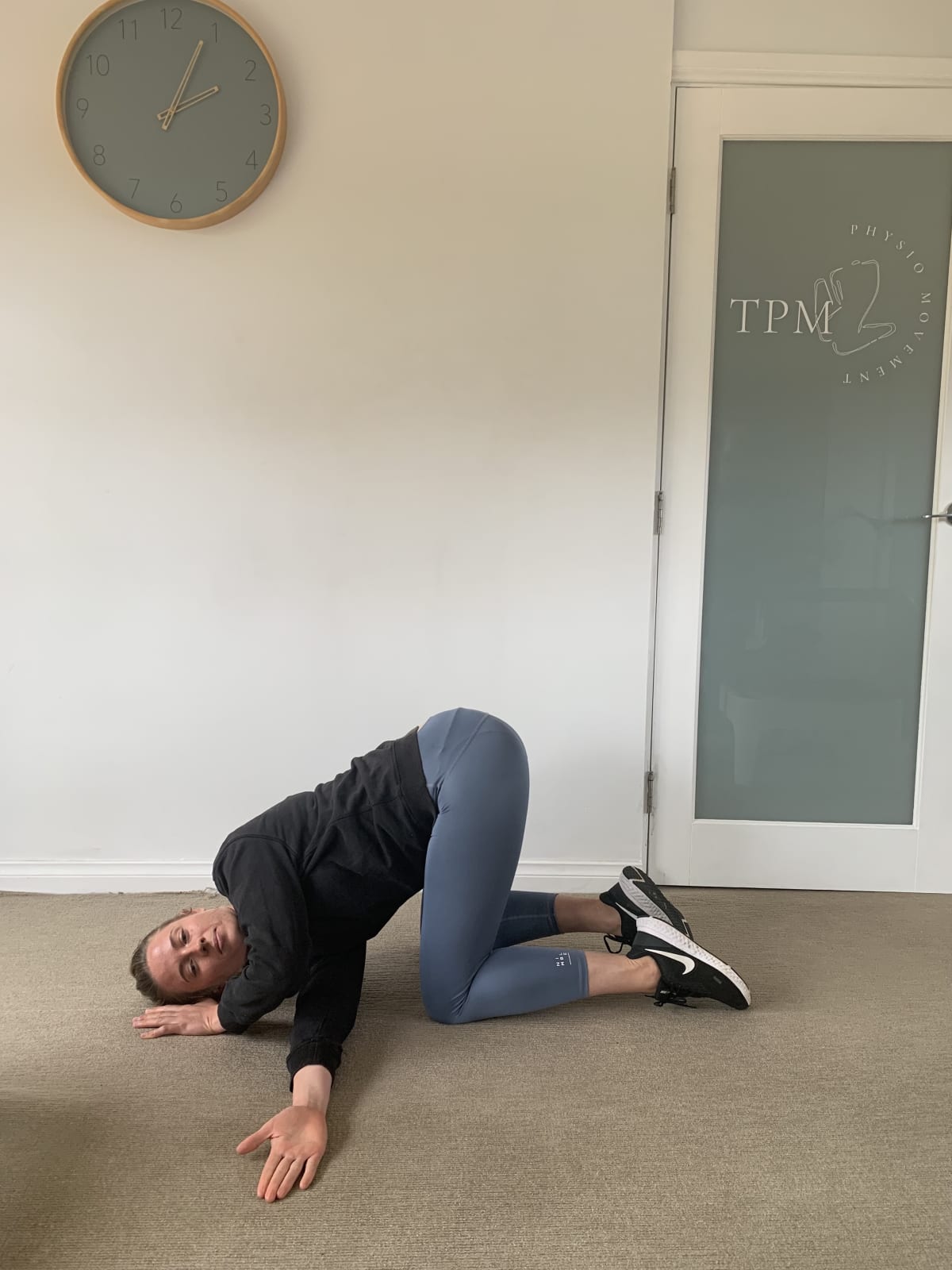 Start on your hands and knees. Reach your right hand through and rotate your spine to drop your right ear and shoulder to the ground. Repeat 6 times per side.