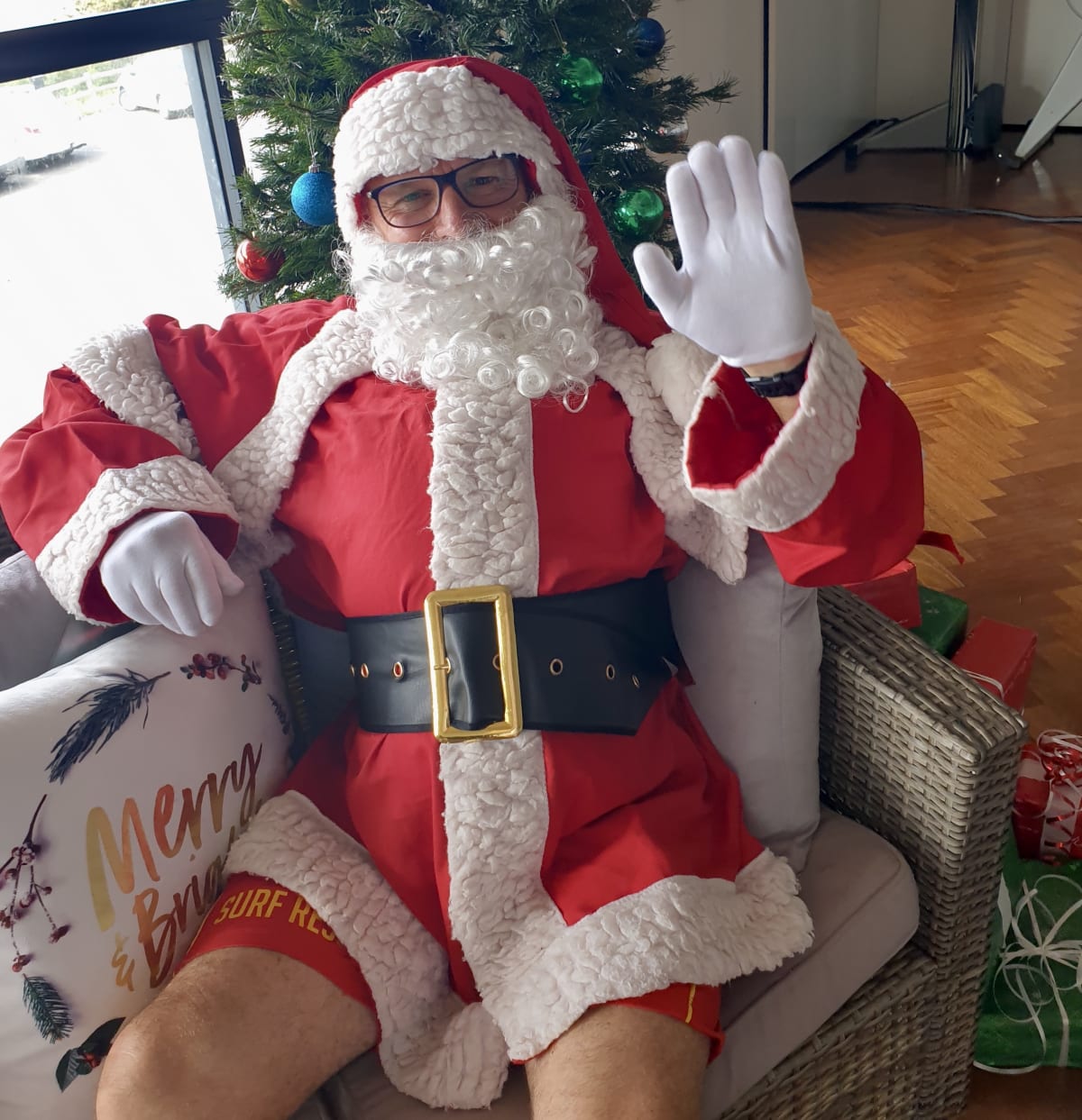 Steven: I’m at Tahnee Social, where the real Santa is. My name is Steven Valentine and I’m 65. I have been performing the Santa role for family and friends for many years. I was a surfing Santa in thongs and once I was the wake-up-Santa-because-he-has-missed-Christmas Santa, where I was pretending to be sound asleep in the bedroom and kids had to wake me up. I was fully dressed in my Santa suit, of course.