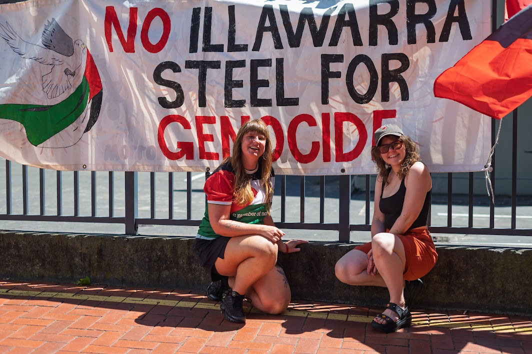 Jett: "A bunch of us came down as part of Wollongong Friends of Palestine - it's a beautiful community street atmosphere and the music is super-fun, but it's also a great opportunity for us to kind of show that we're still here, we're still showing up for Palestine. And especially in the Illawarra, where steel that's manufactured here goes and to be used against Palestinians, it's really important for us to show that every time something happens, we're here and we're flying that banner."