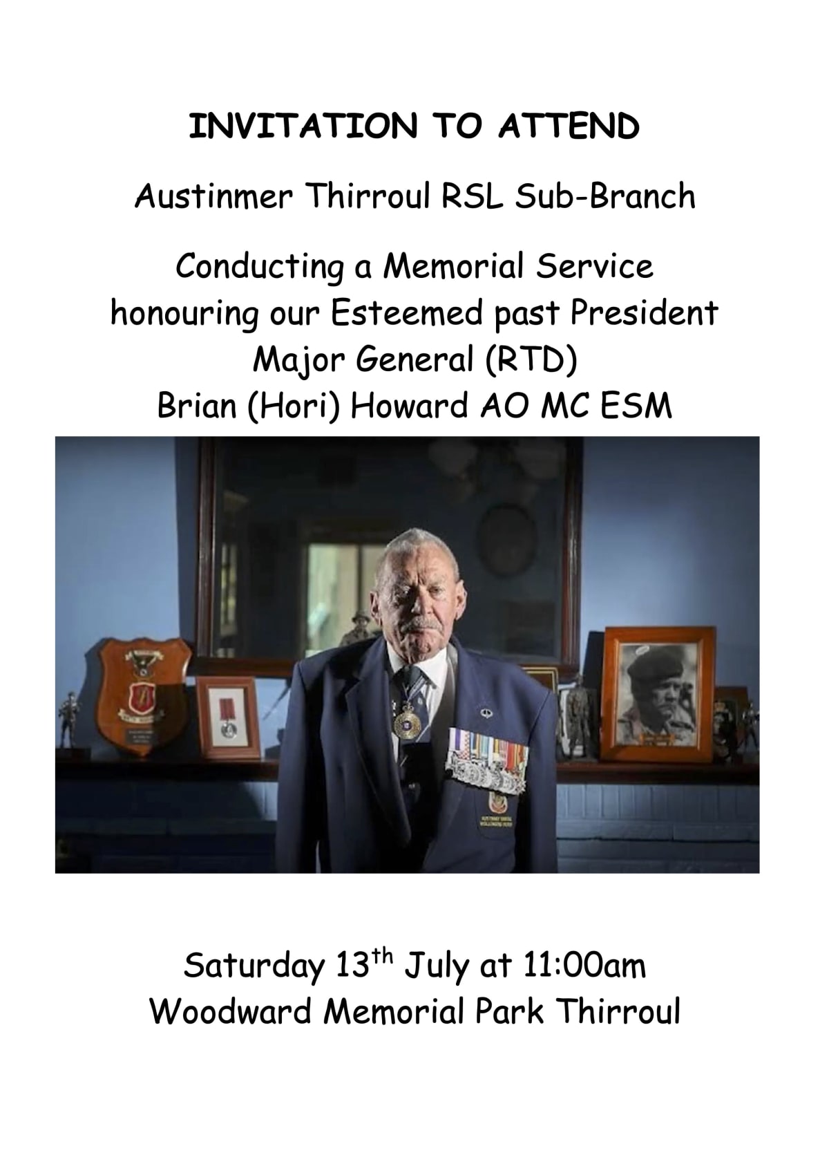 Members of the public are invited to attend Austinmer Thirroul RSL Sub-Branch’s Memorial Service for its esteemed past president, Major General (RTD) Brian 'Hori' Howard AO MC ESM, on Saturday, 13 July at 11am Woodward Memorial Park, Thirroul.