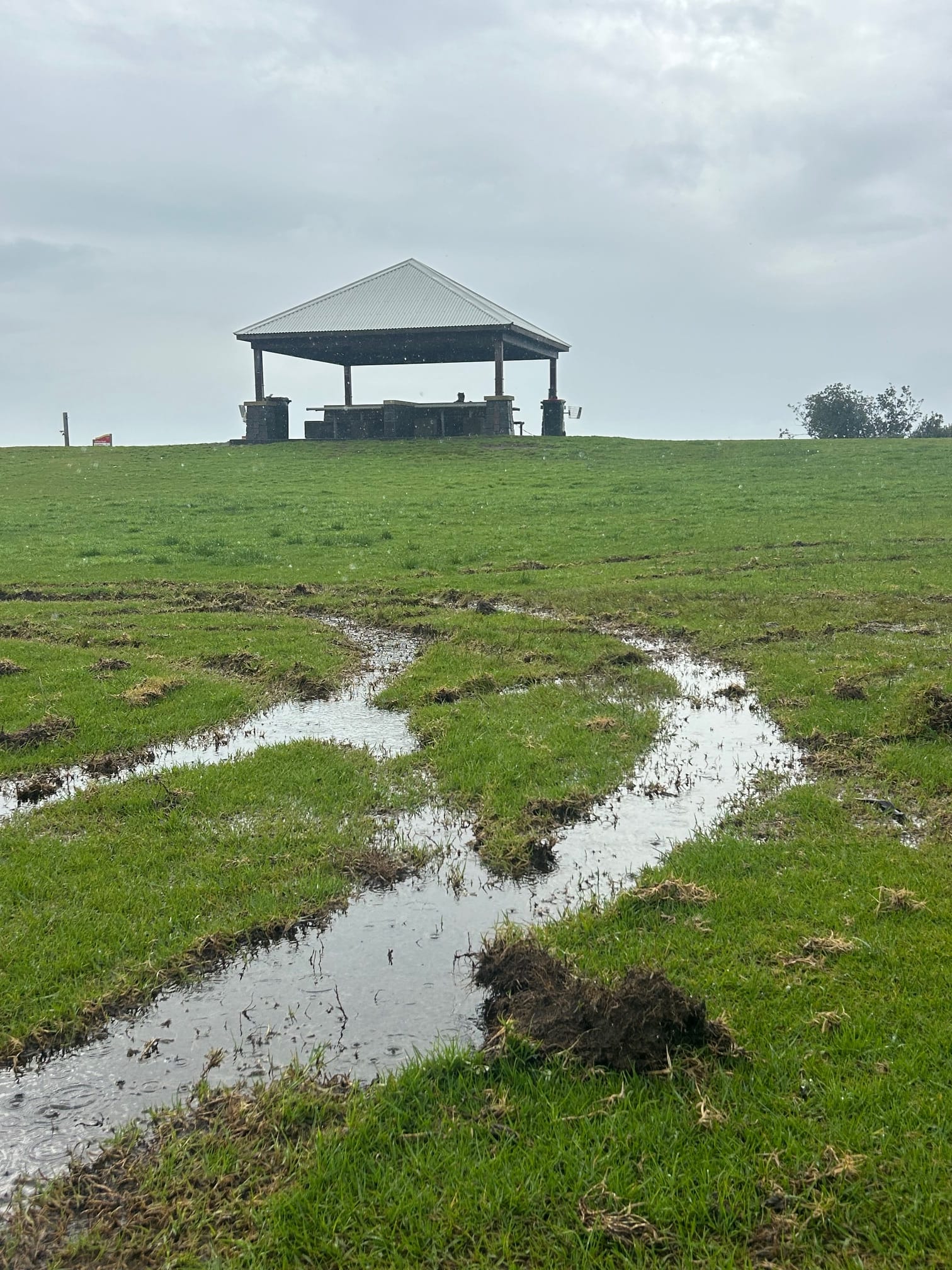 Months later, despite Council’s repair efforts, the large grassed area is still recovering.
