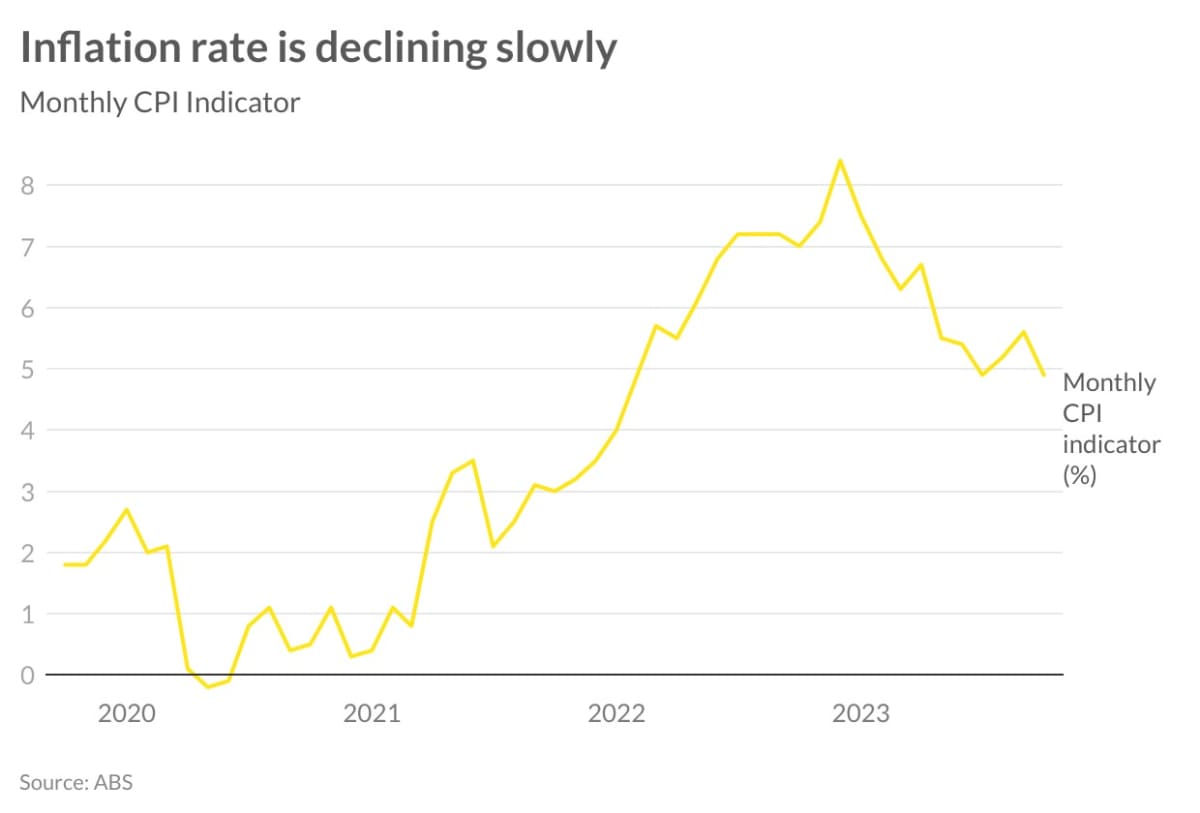 The main reason for the decision was the recent economic news on inflation, which for the 12 months to October 2023 was 4.9%. While this is still above the RBA’s target it is continuing to show a downward trend seen below in the graph.