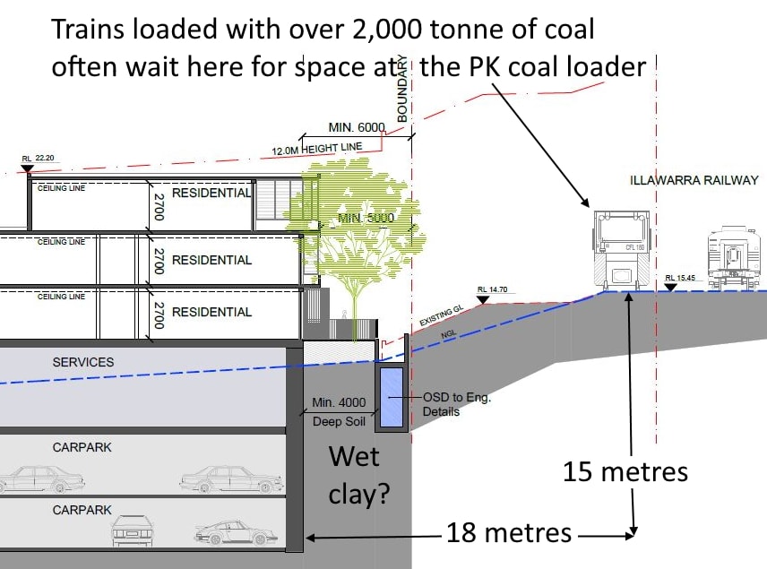 Could a 150m-long excavation that is probably three times as deep as any other basement in Thirroul, directly adjacent to the main South Coast rail line, cut through underground water and clay seams and antagonise a new “greasyback” and put at risk the South Coast rail link?