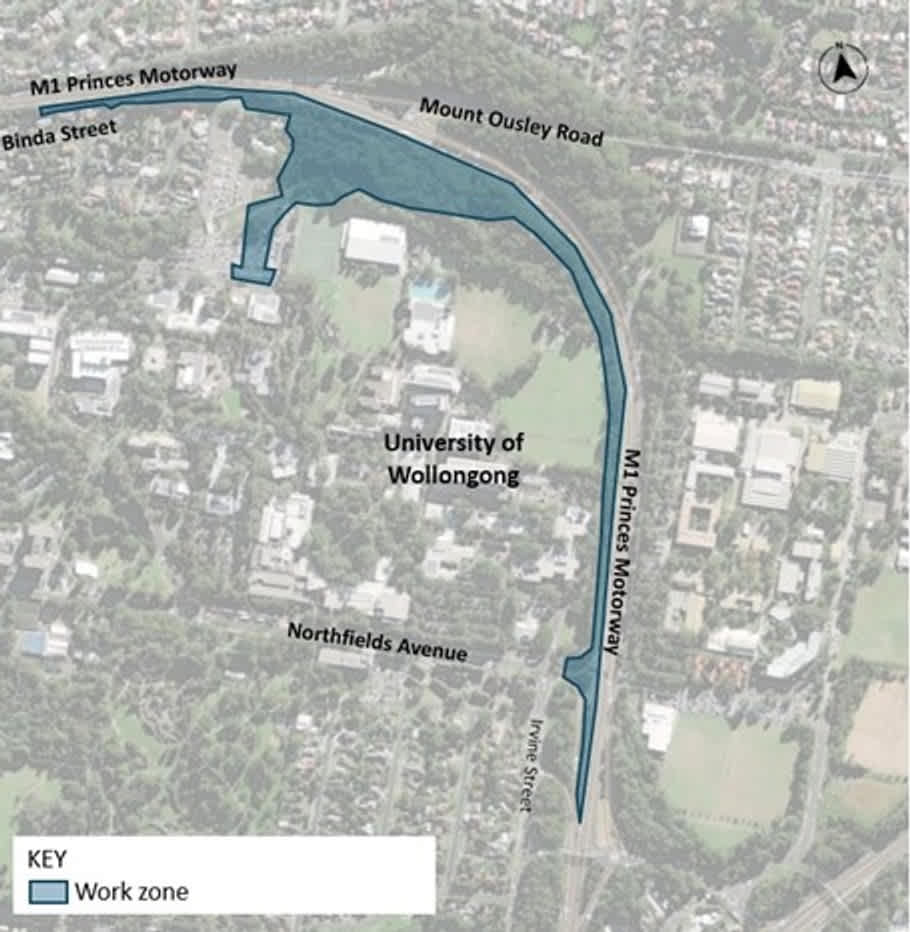 The new area to be impacted between now and the end of May runs from Binda Street and Falder Place to the north of the UOW Sports Hub and along the motorway at the university's sportsfield boundary.