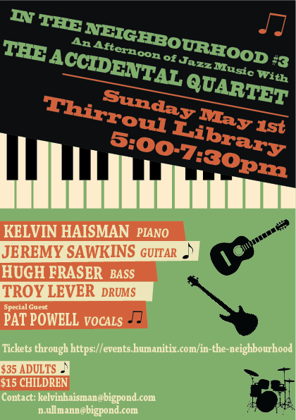Each concert features a different guest vocalist backed by the Accidental Quartet comprising Jeremy Sawkins on guitar, Hugh Fraser on bass, Troy Lever on drums, myself on piano.