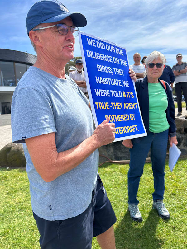 Malcolm Barry brought a jet ski, which he put on the water to demonstrate "how quiet" they are, and posted signs along the jetty refuting claims by his opponents. He also offered the crowd a chance to ask questions.
