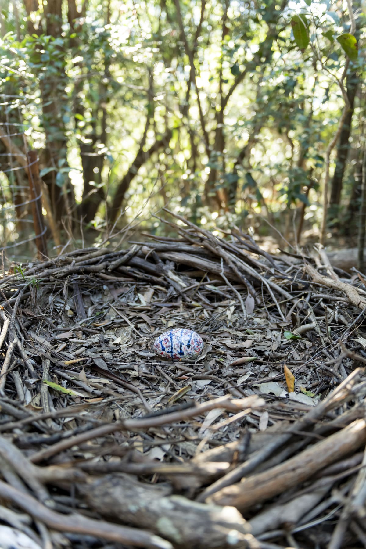 Lining the bush track from Stanwell Park kiosk up to Stanwell Avenue are giant bird’s nests woven with stalks of lantana, senna and ochna. All terrible invasive weeds choking our rainforest, now reinvented as bush sculpture.