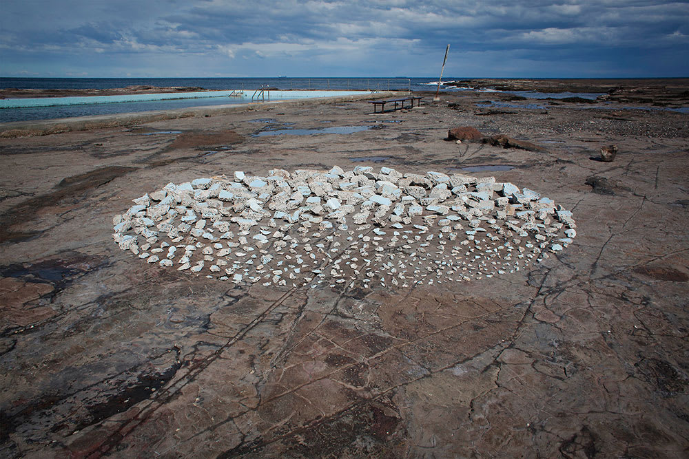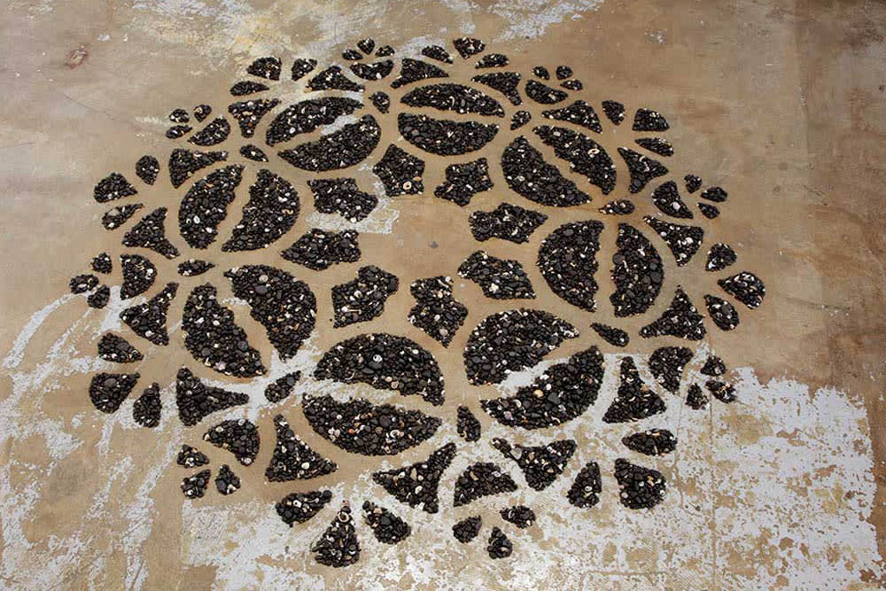 "In High Tide New Moon 7 April 2019 pebbles are arranged in the shape of an antique lace doily, echoing the overlay of one culture upon another. The diameter of the circle is the same as the highest tide occurring on the new moon within the exhibition period.”